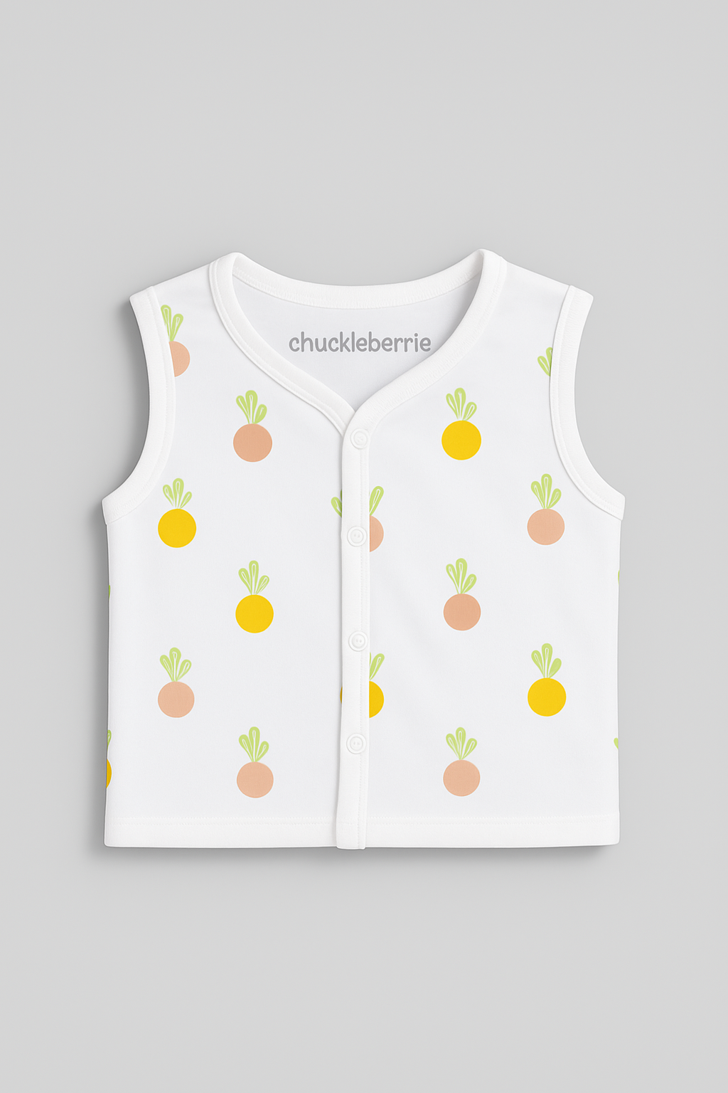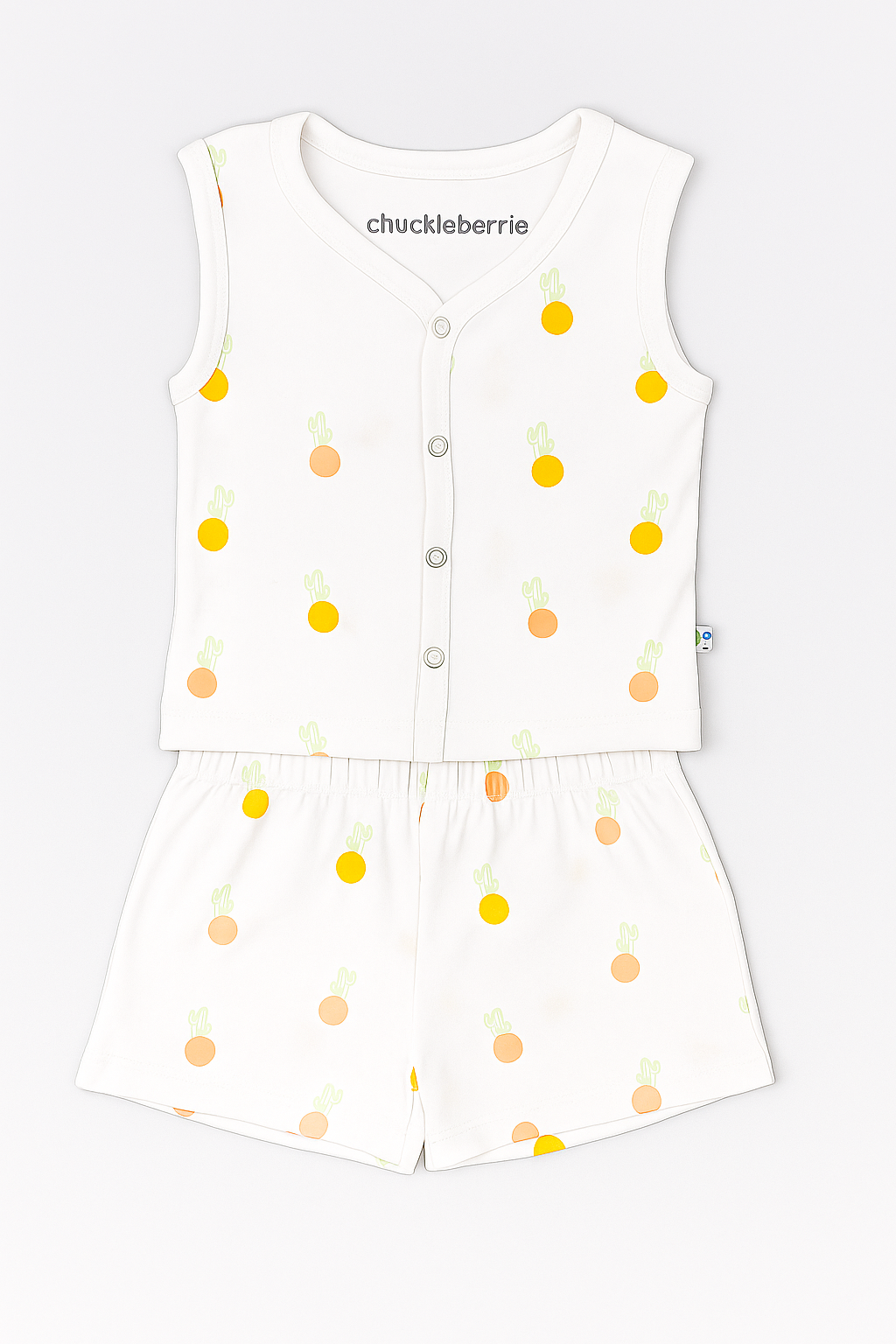 Crafted with breathable cotton, this sleeveless co-ord set features a front press stud closure top and coordinating shorts with a soft enclosed elasticated waistband. Printed with small repetitive motifs.