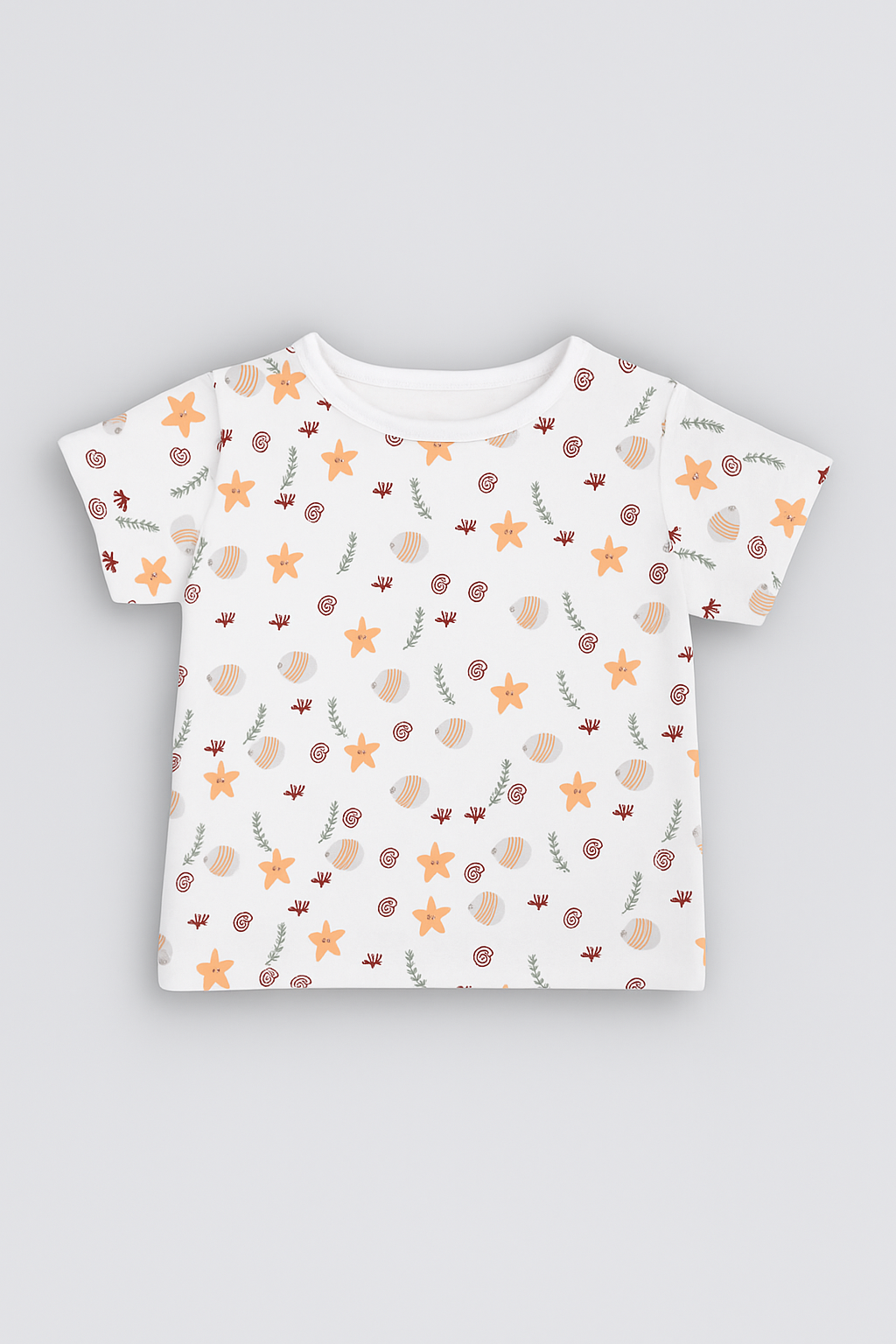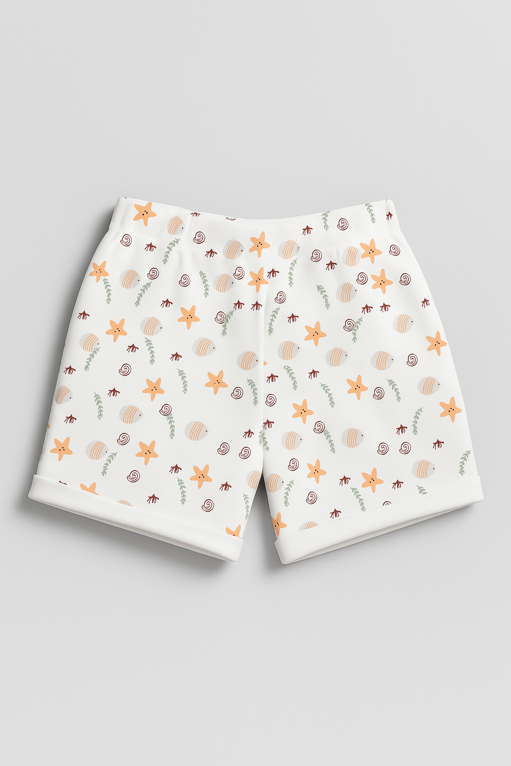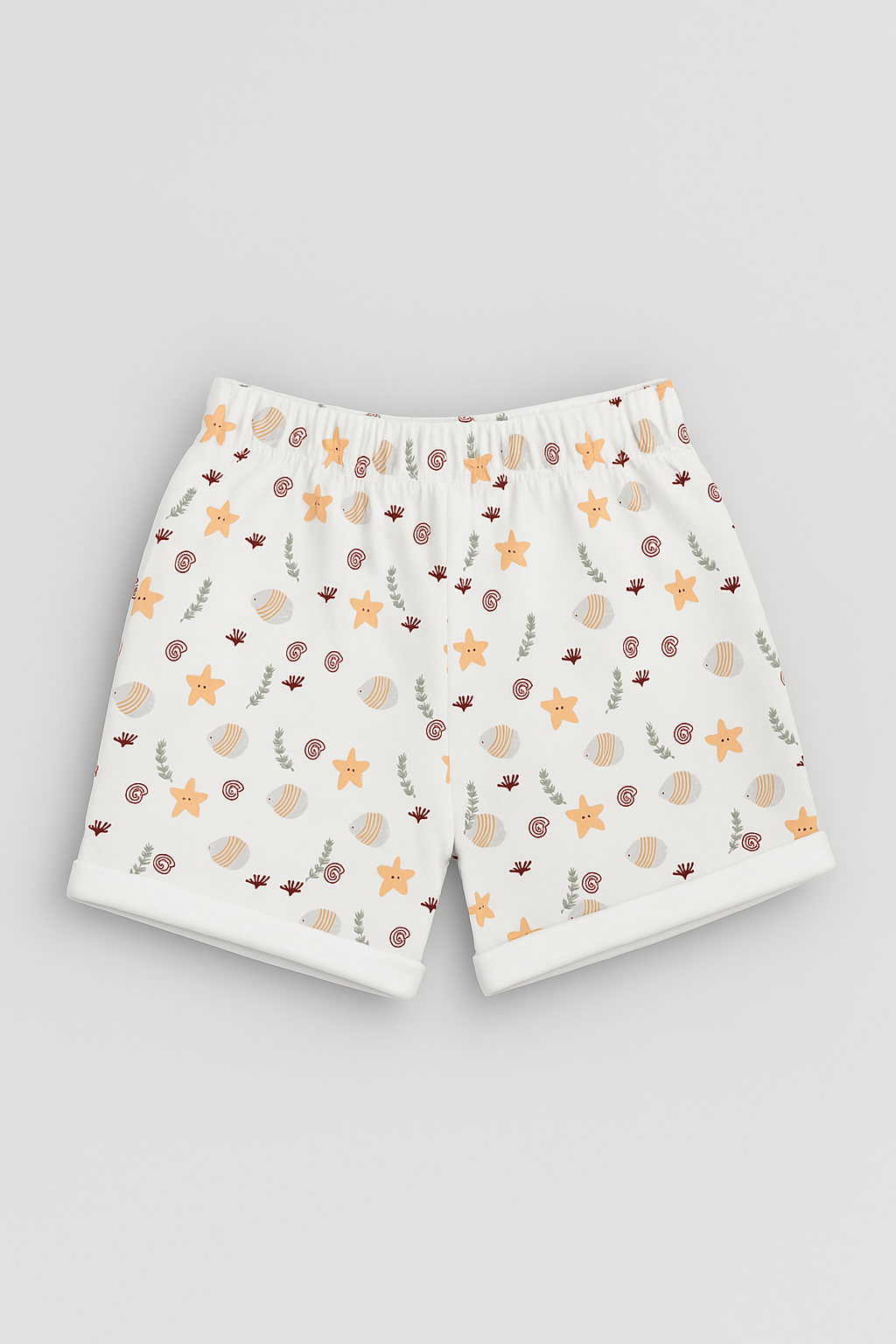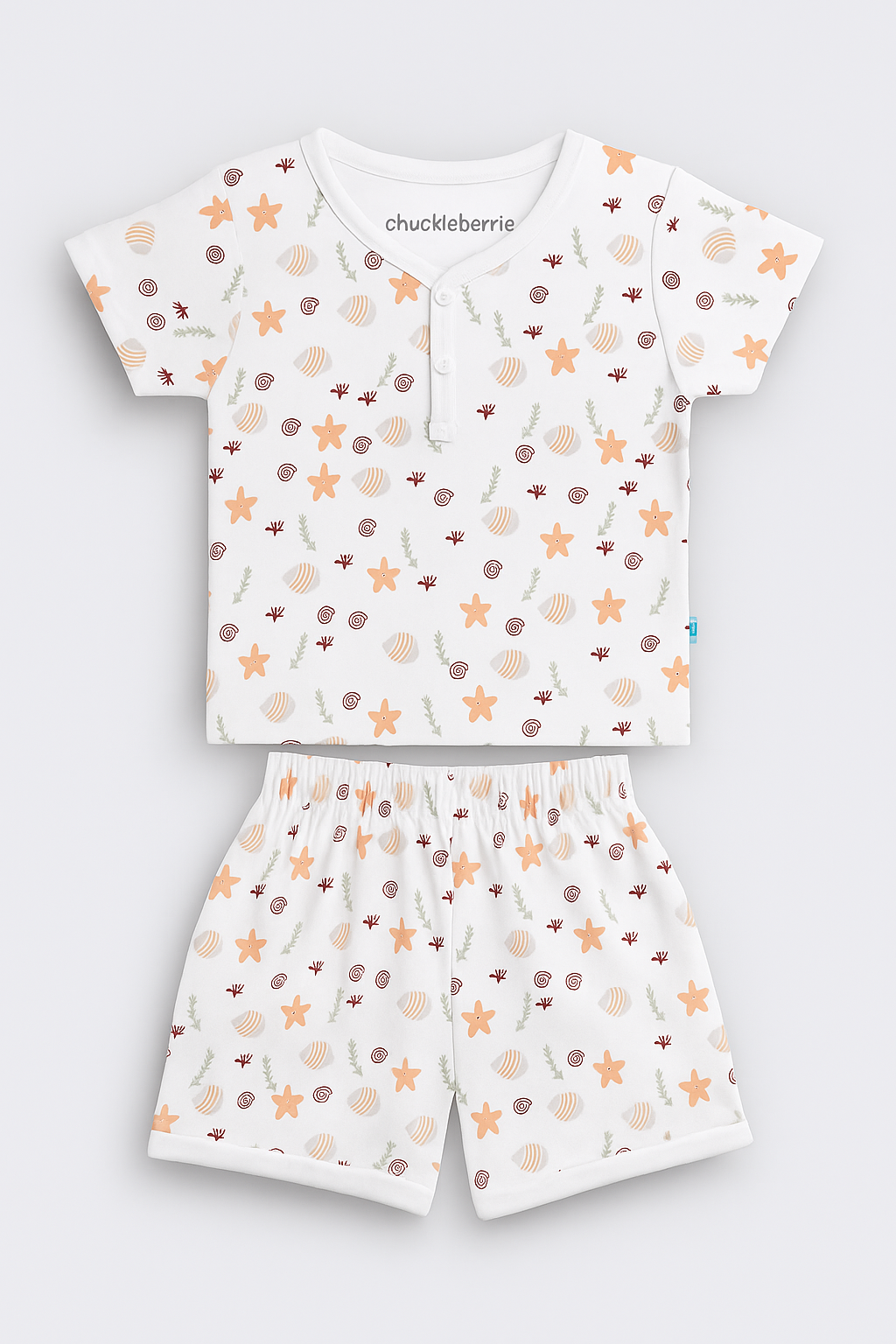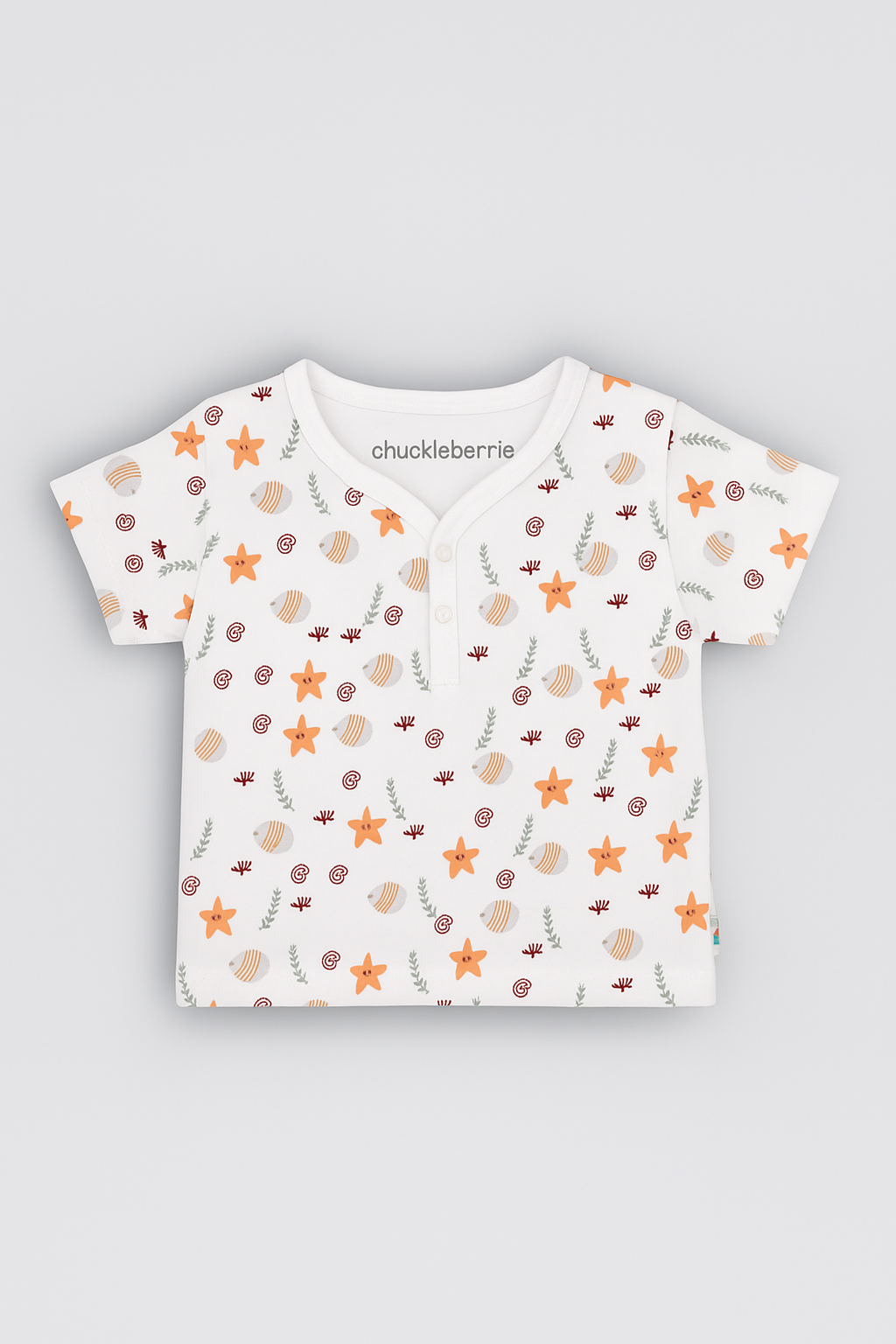 Half-sleeved cotton henley co-ord set with front button placket on the tee, featuring ocean-inspired all over print and a stretch waistband with side pockets.