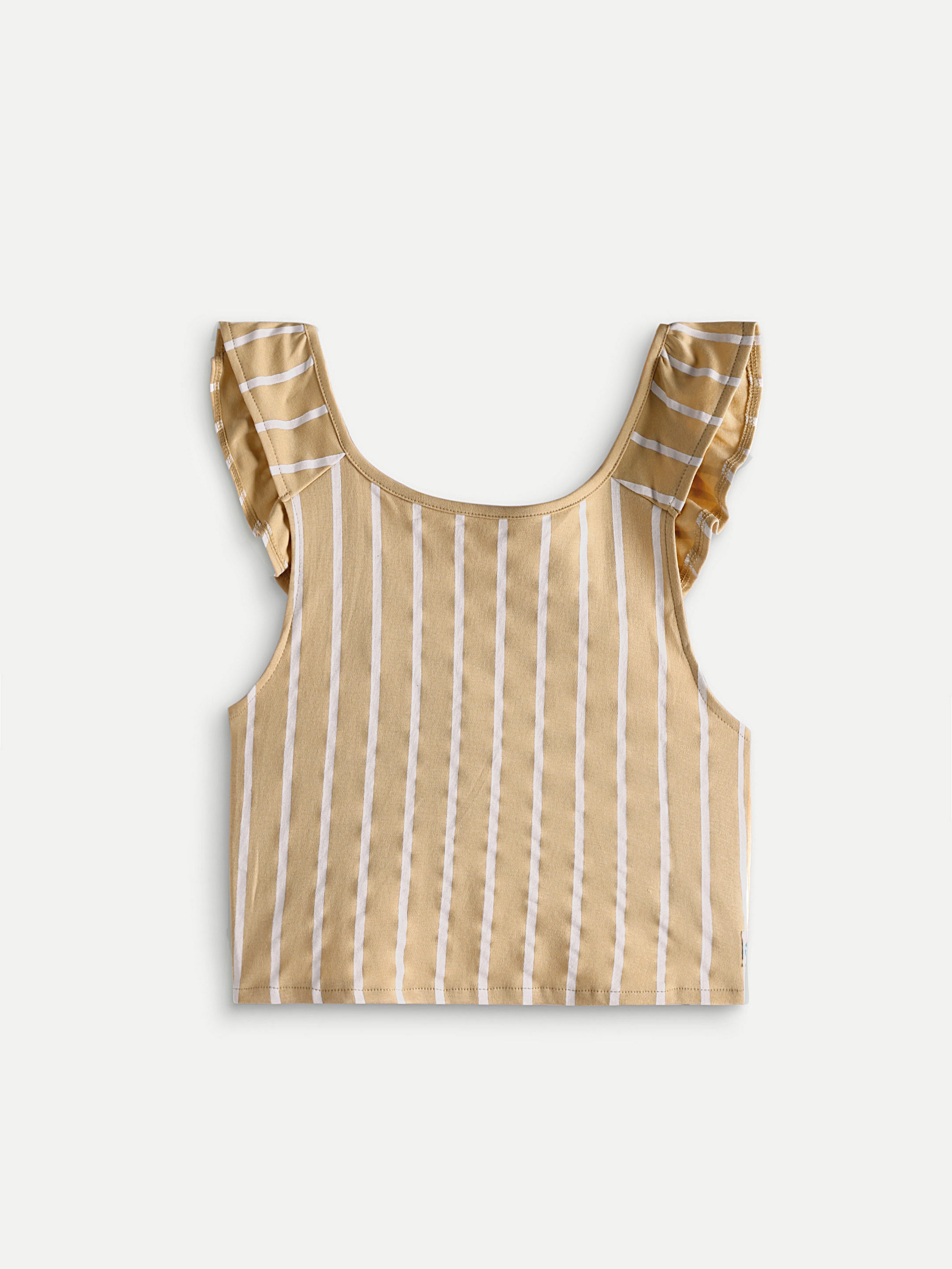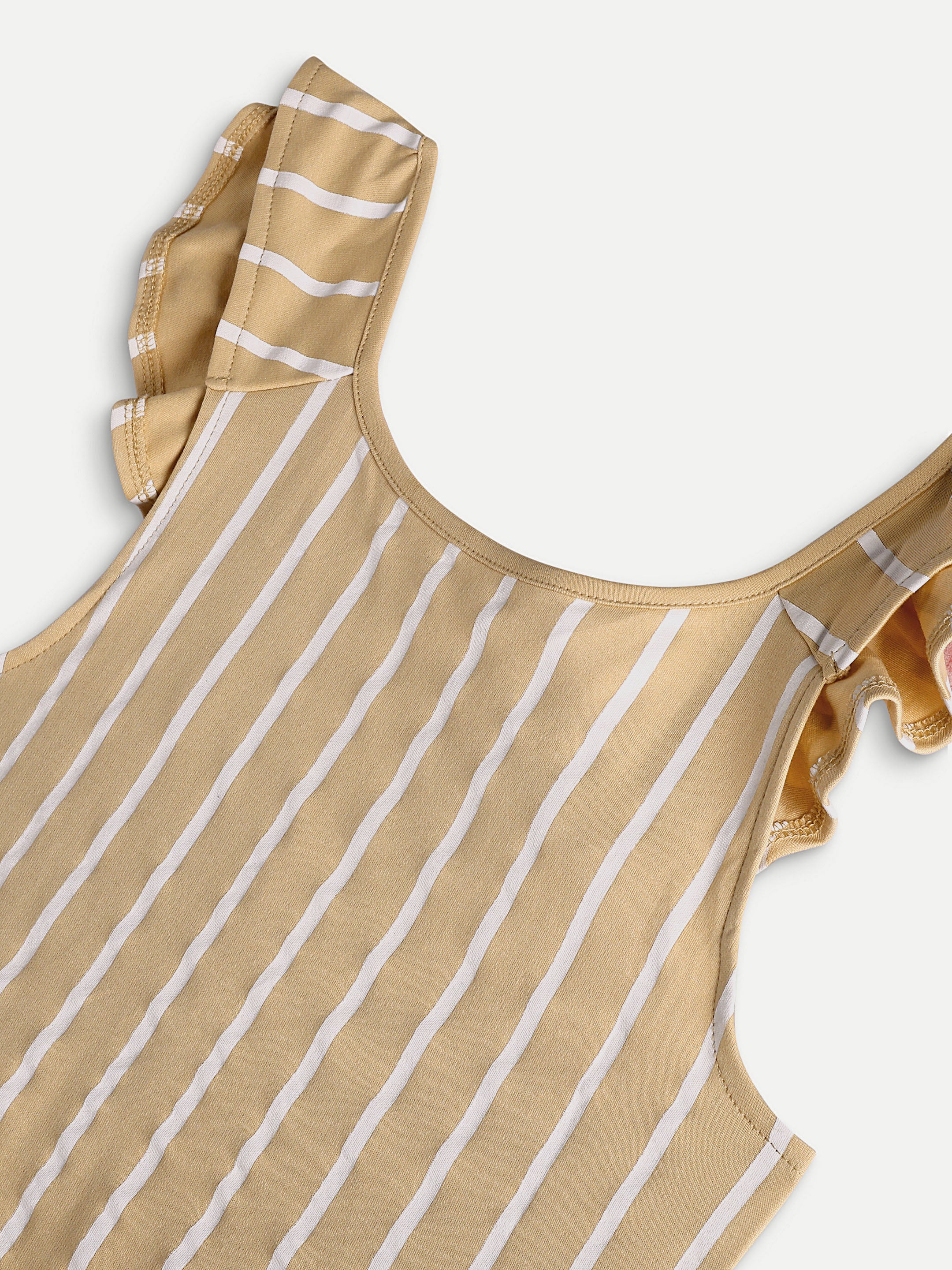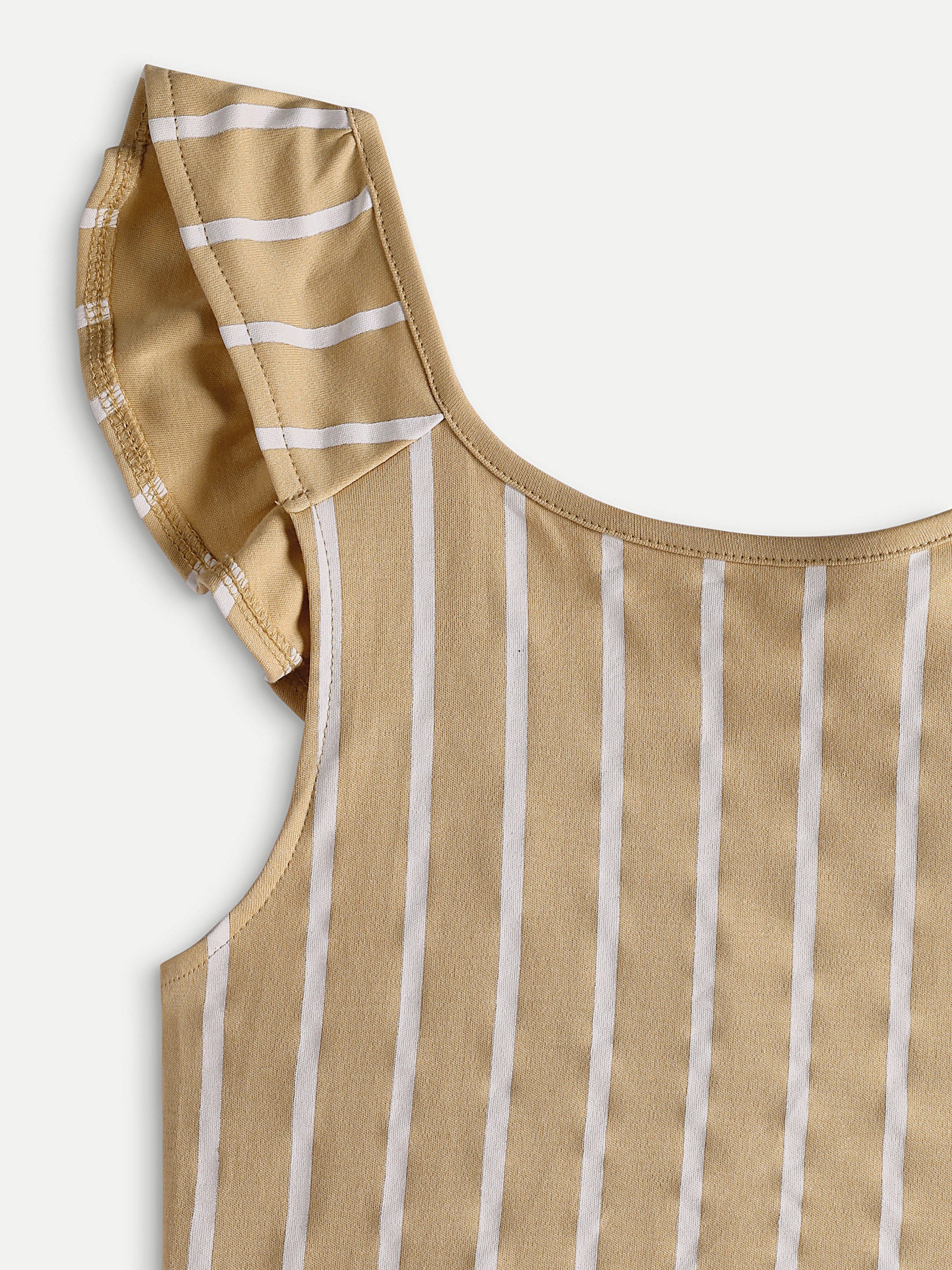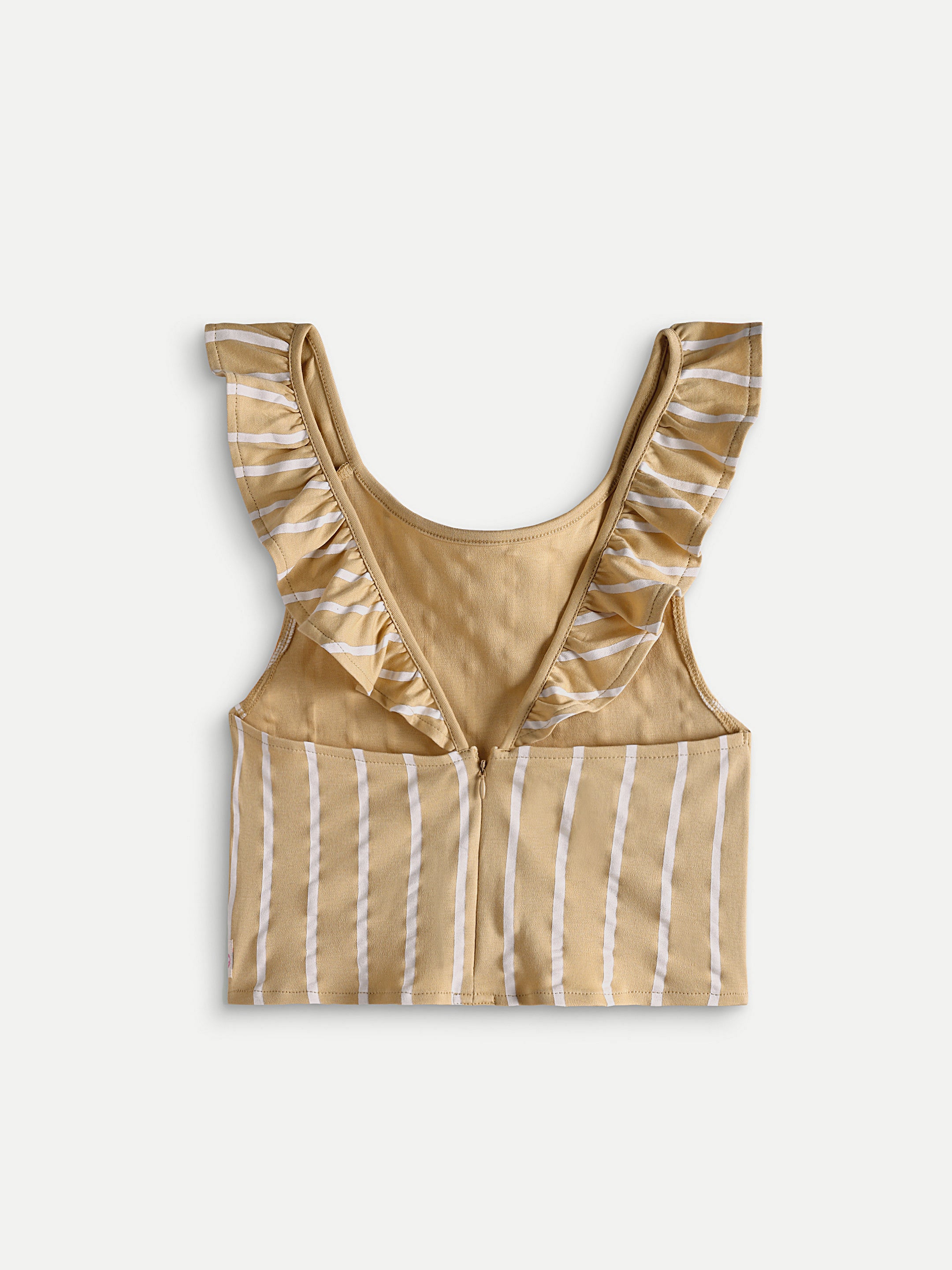 Cotton two-piece set includes a striped crop top and skirt, both adorned with playful frills. The back zip adds convenience, while the soft fabric ensures comfort.