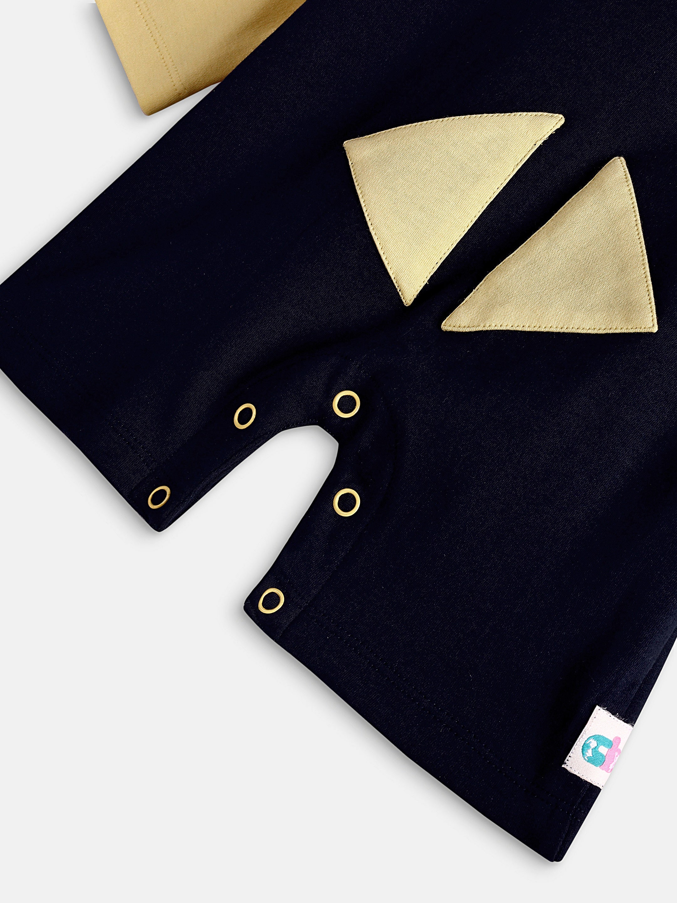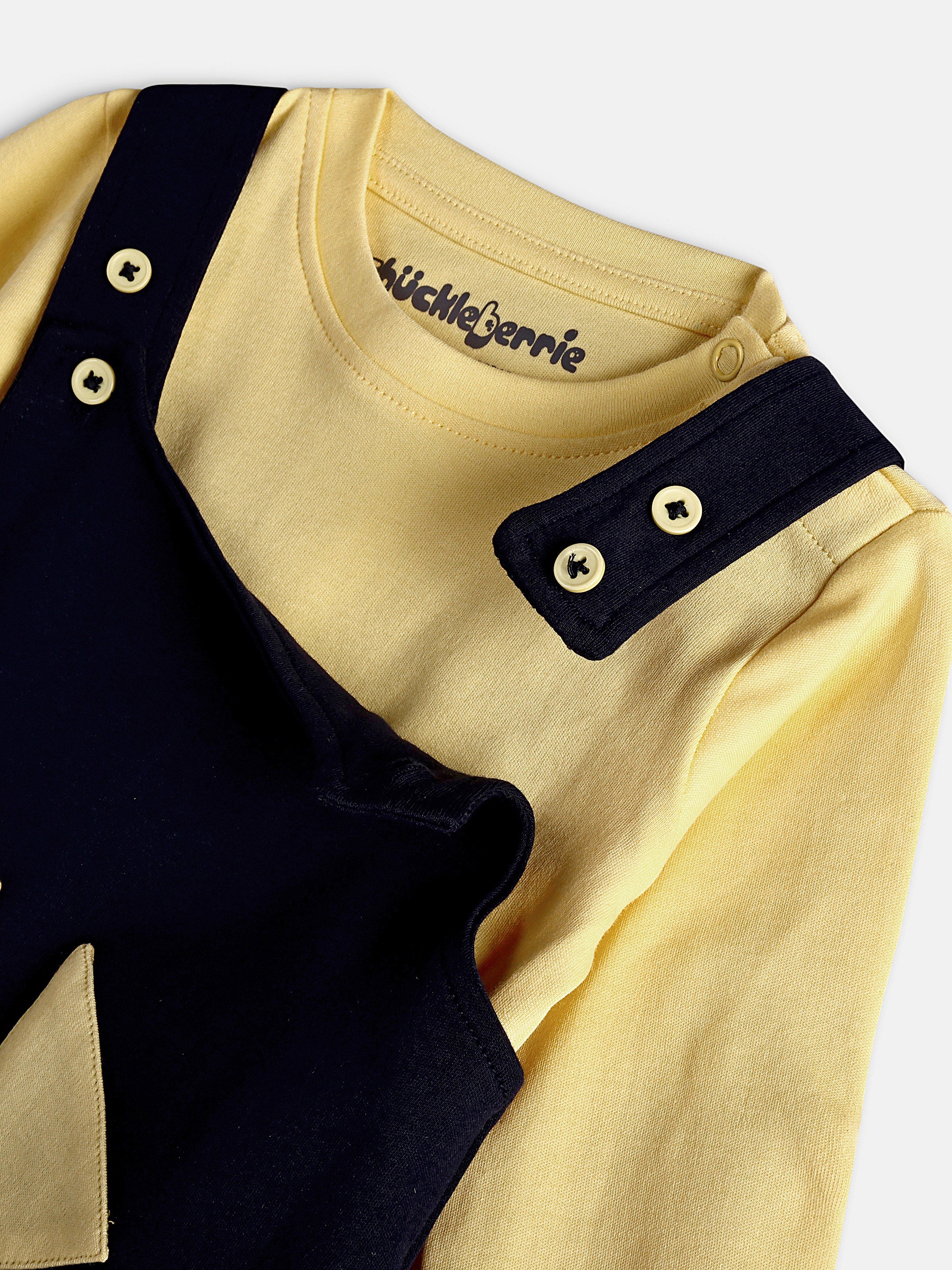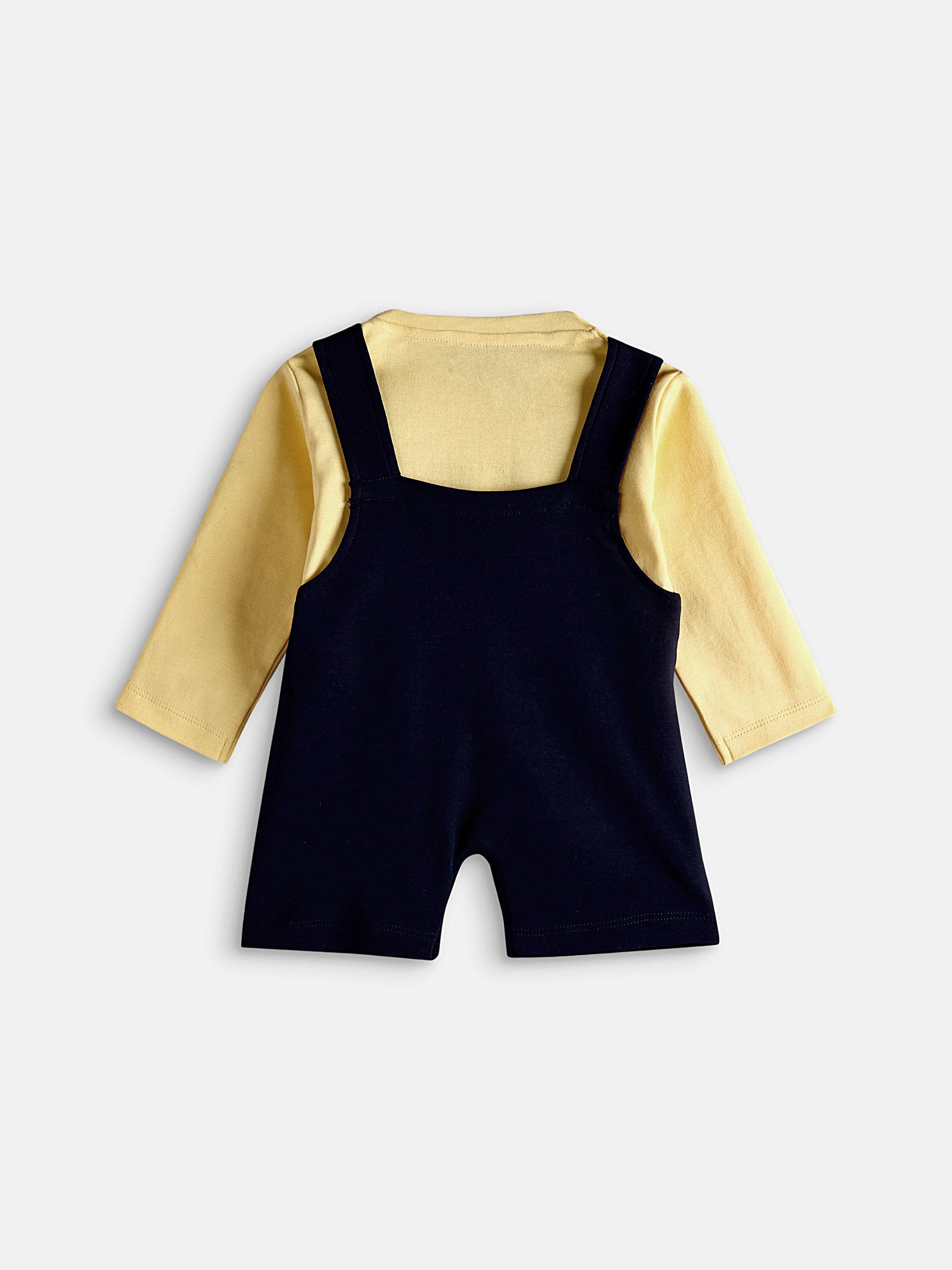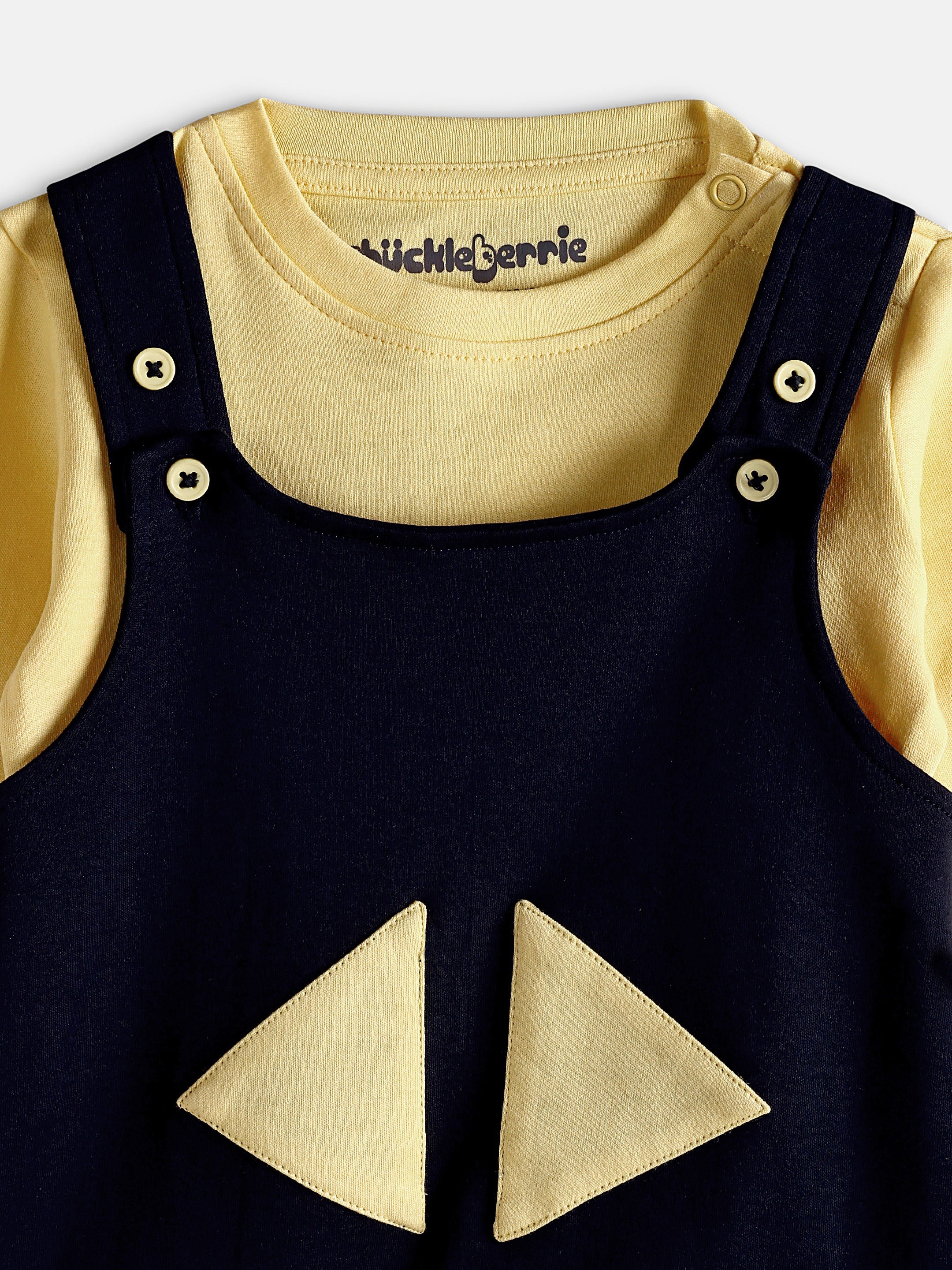 Soft French terry dungaree romper with contrast inner tee, triangular patch pockets, and snap buttons for easy wear.