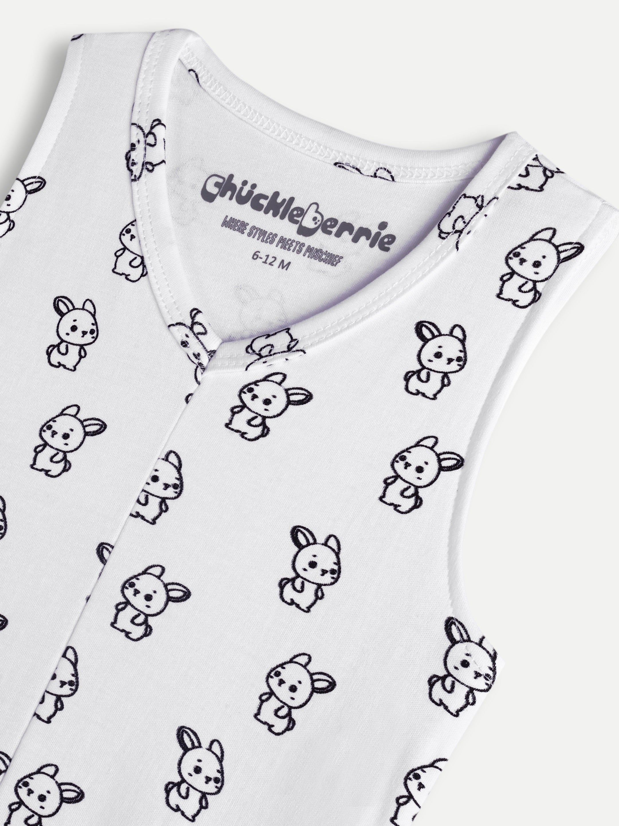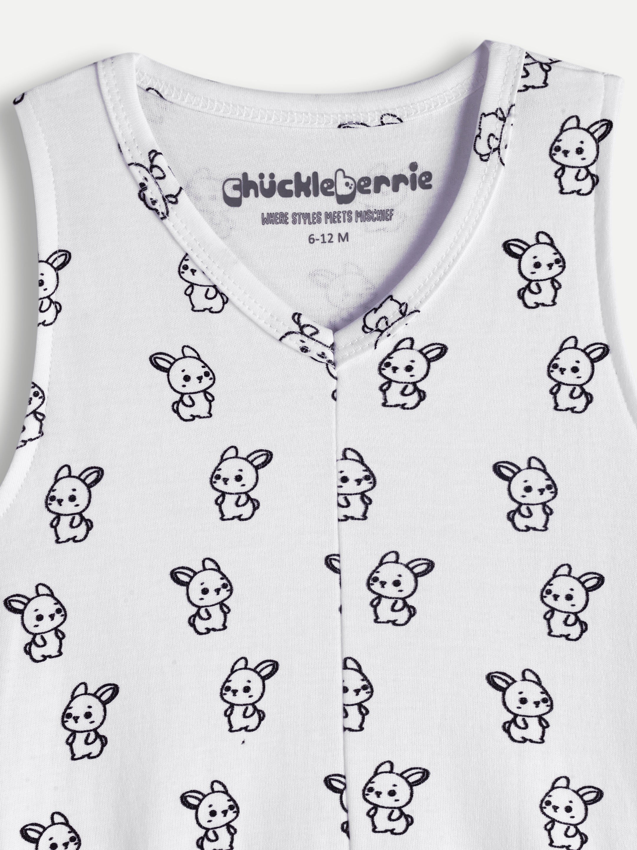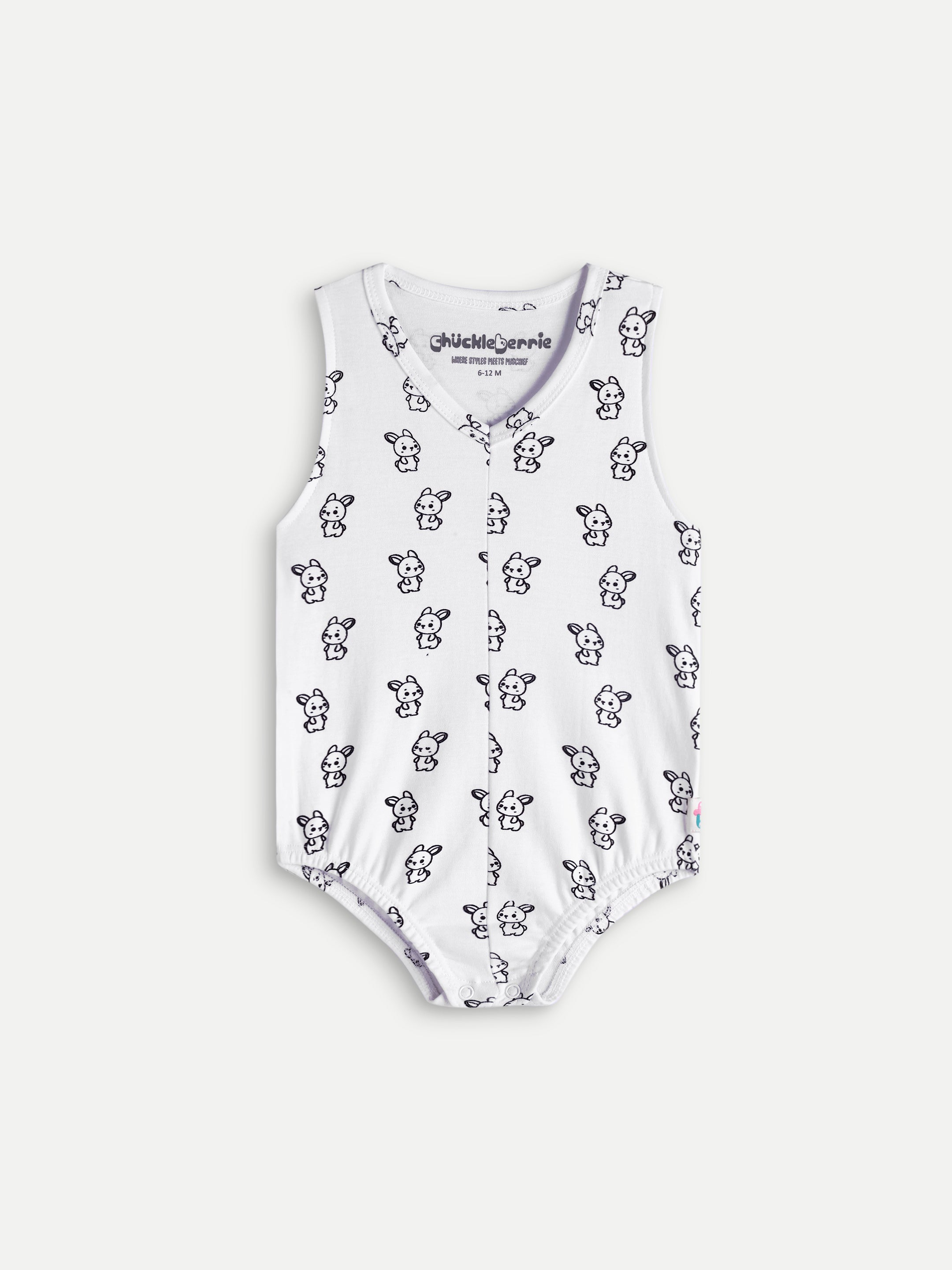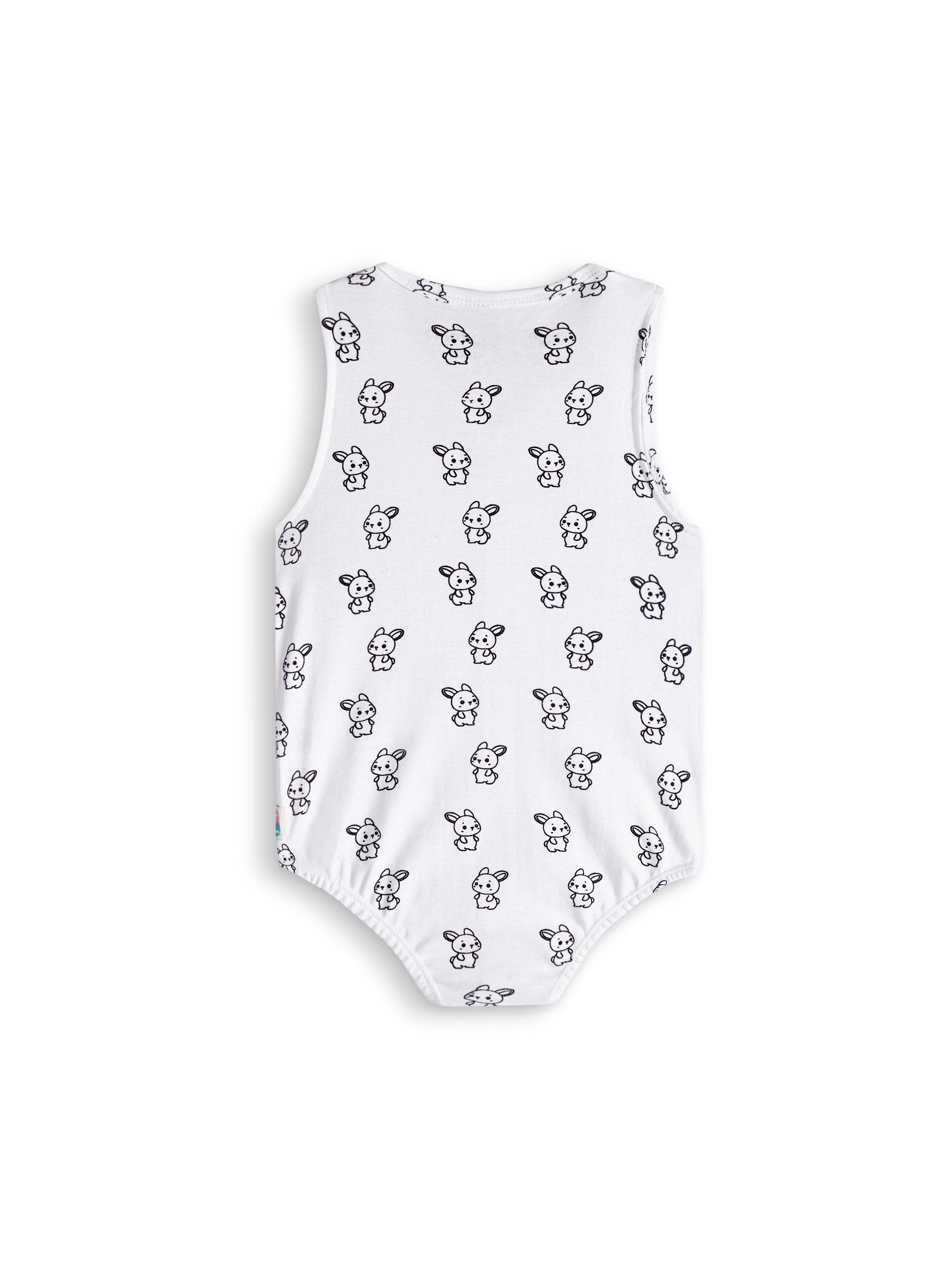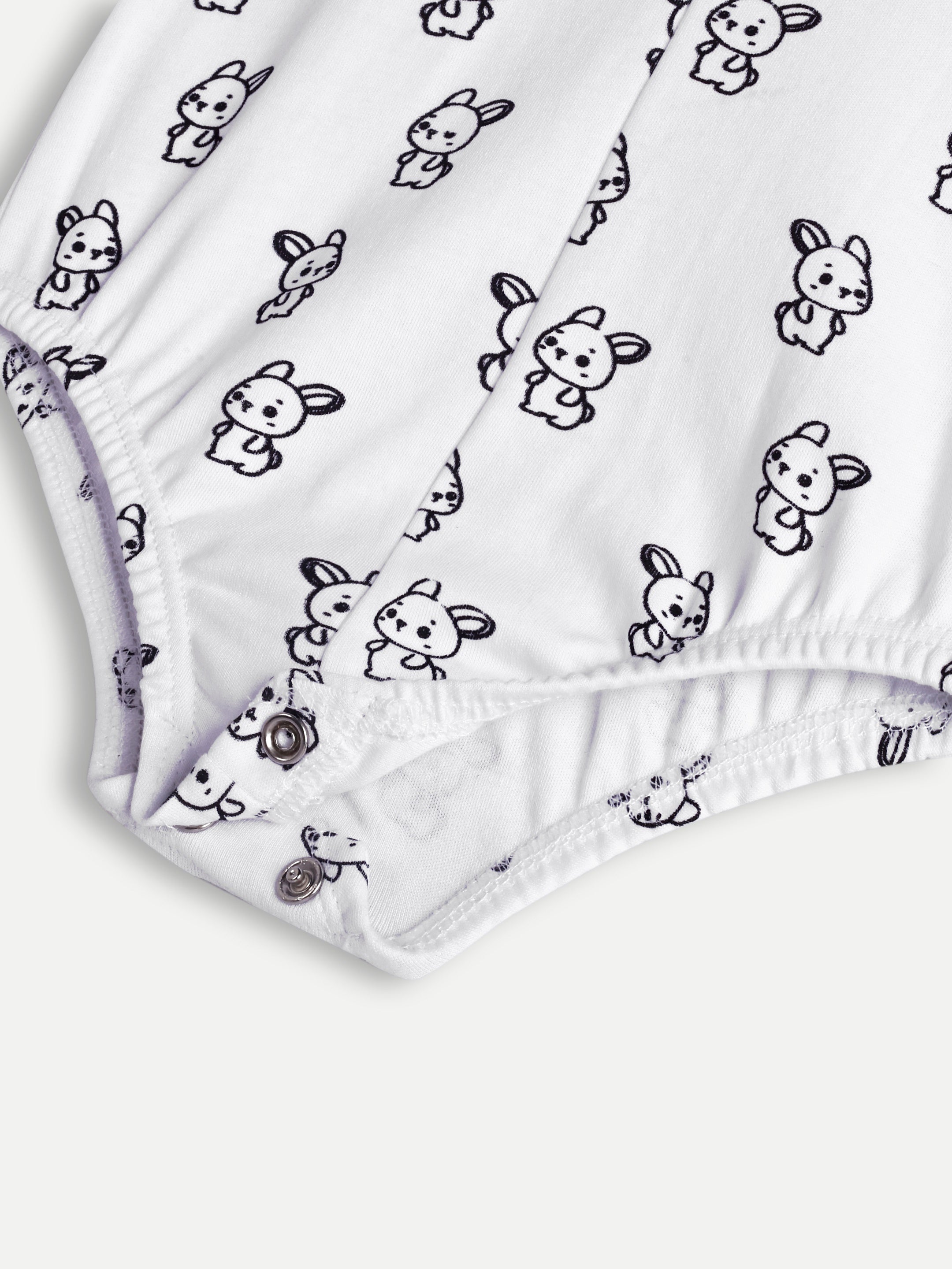 Cotton V-neck bunny print onesies with snap button and soft elastic at the opening.
