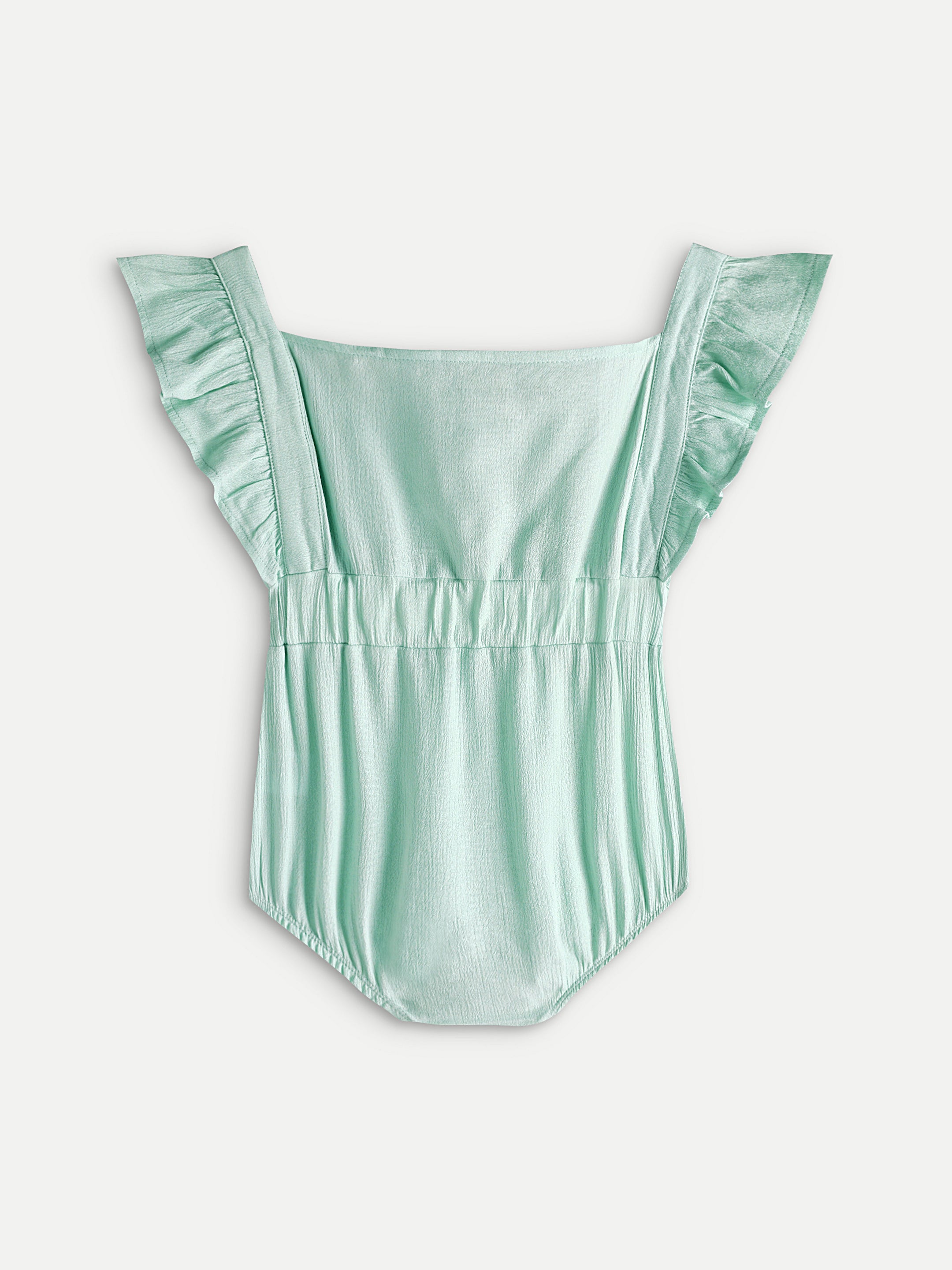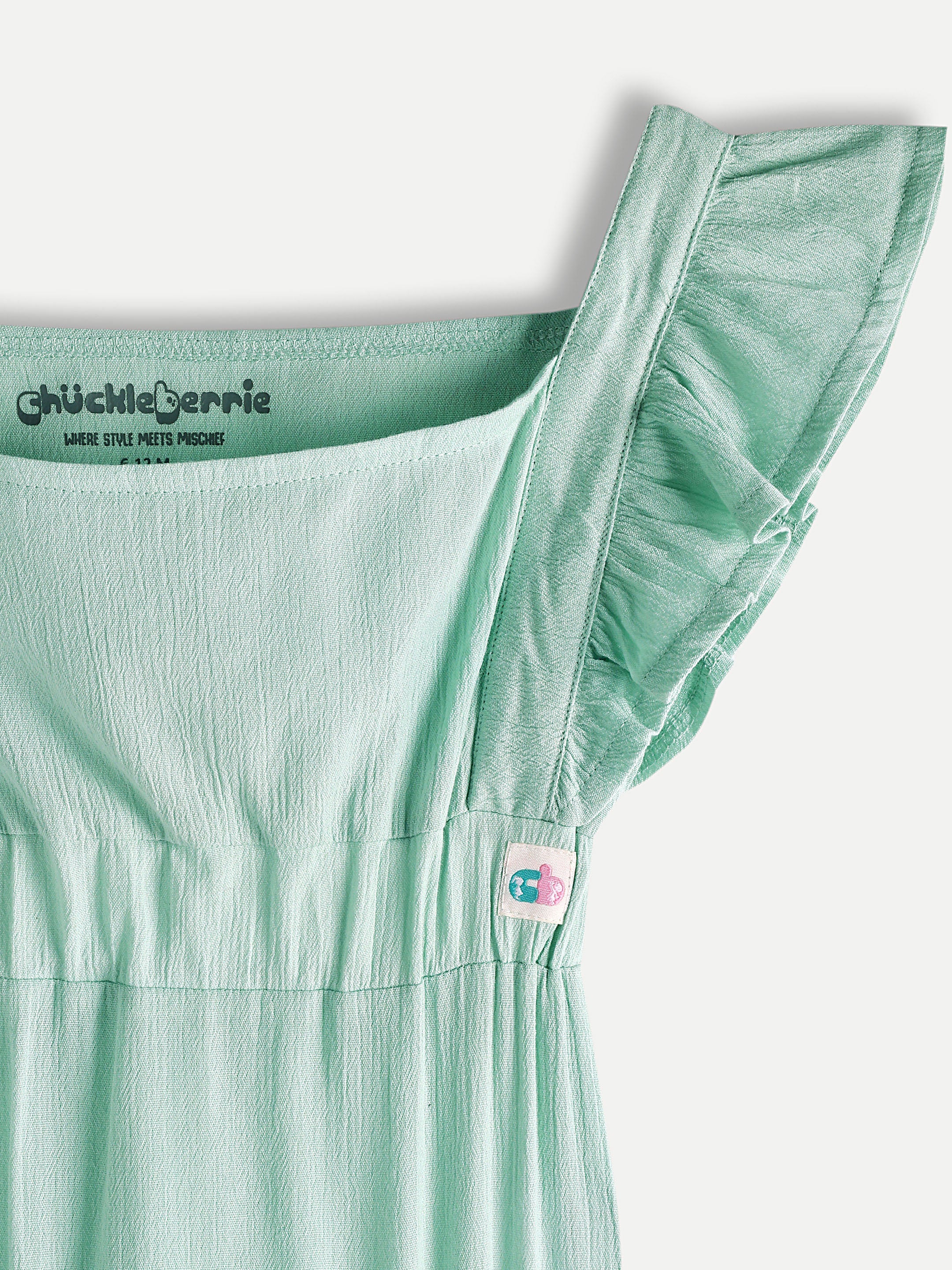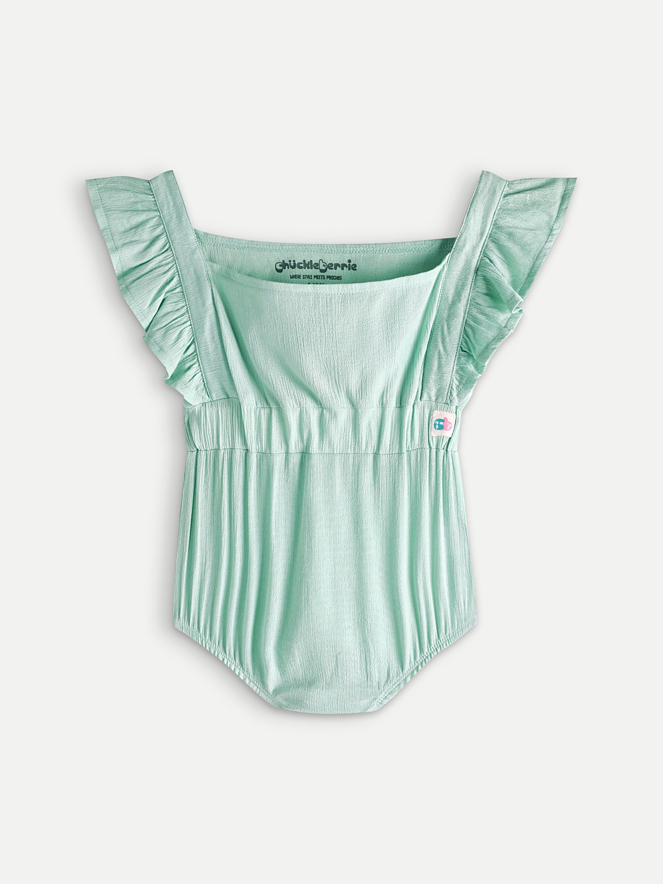Cotton muslin ruffle strap onesies with soft elastic and snap closure at bottom.