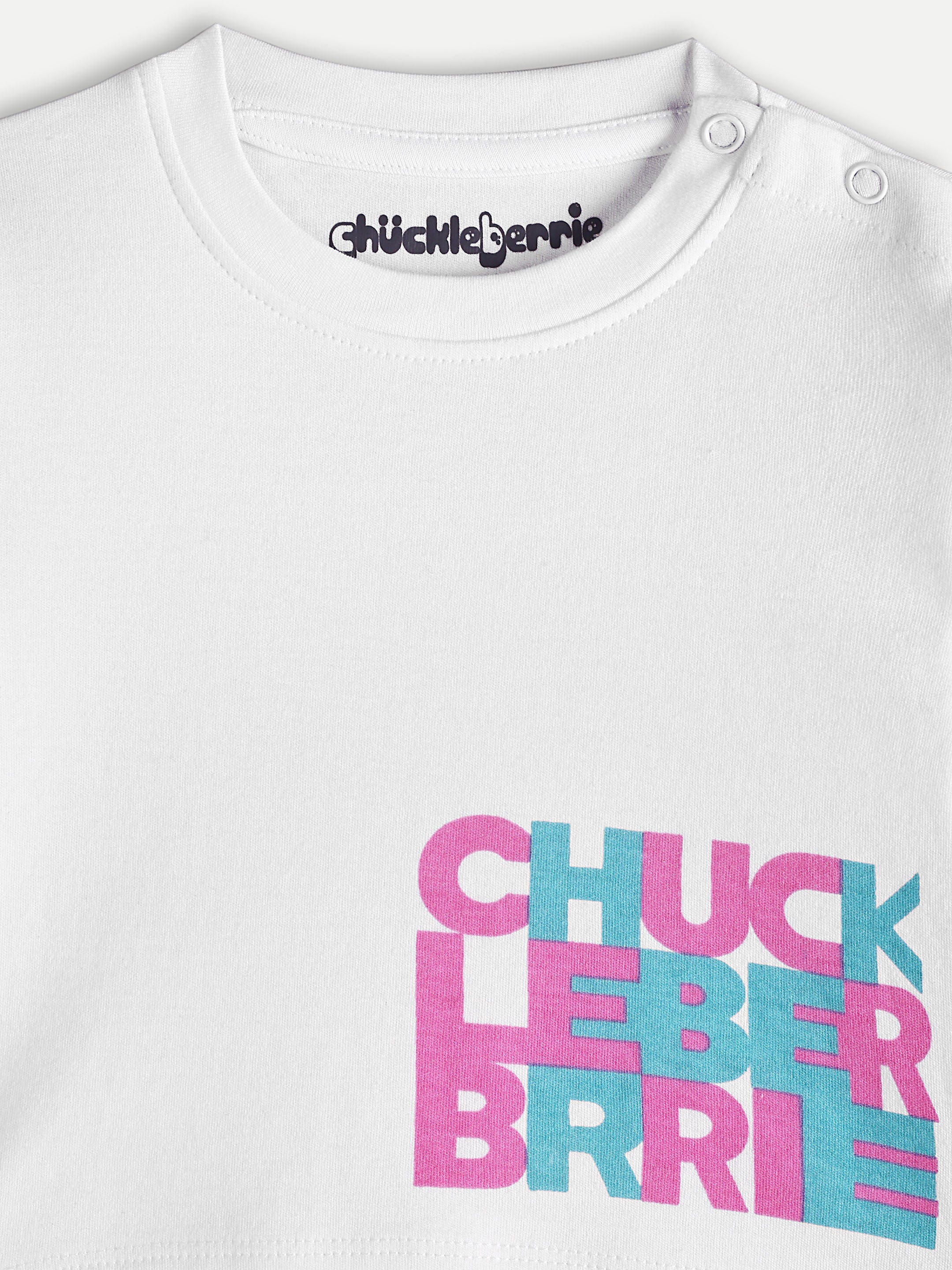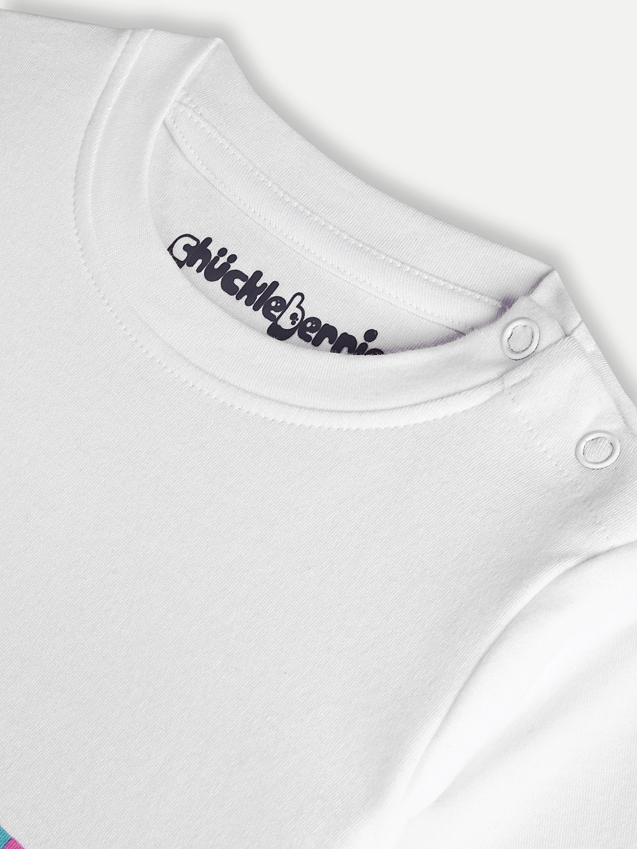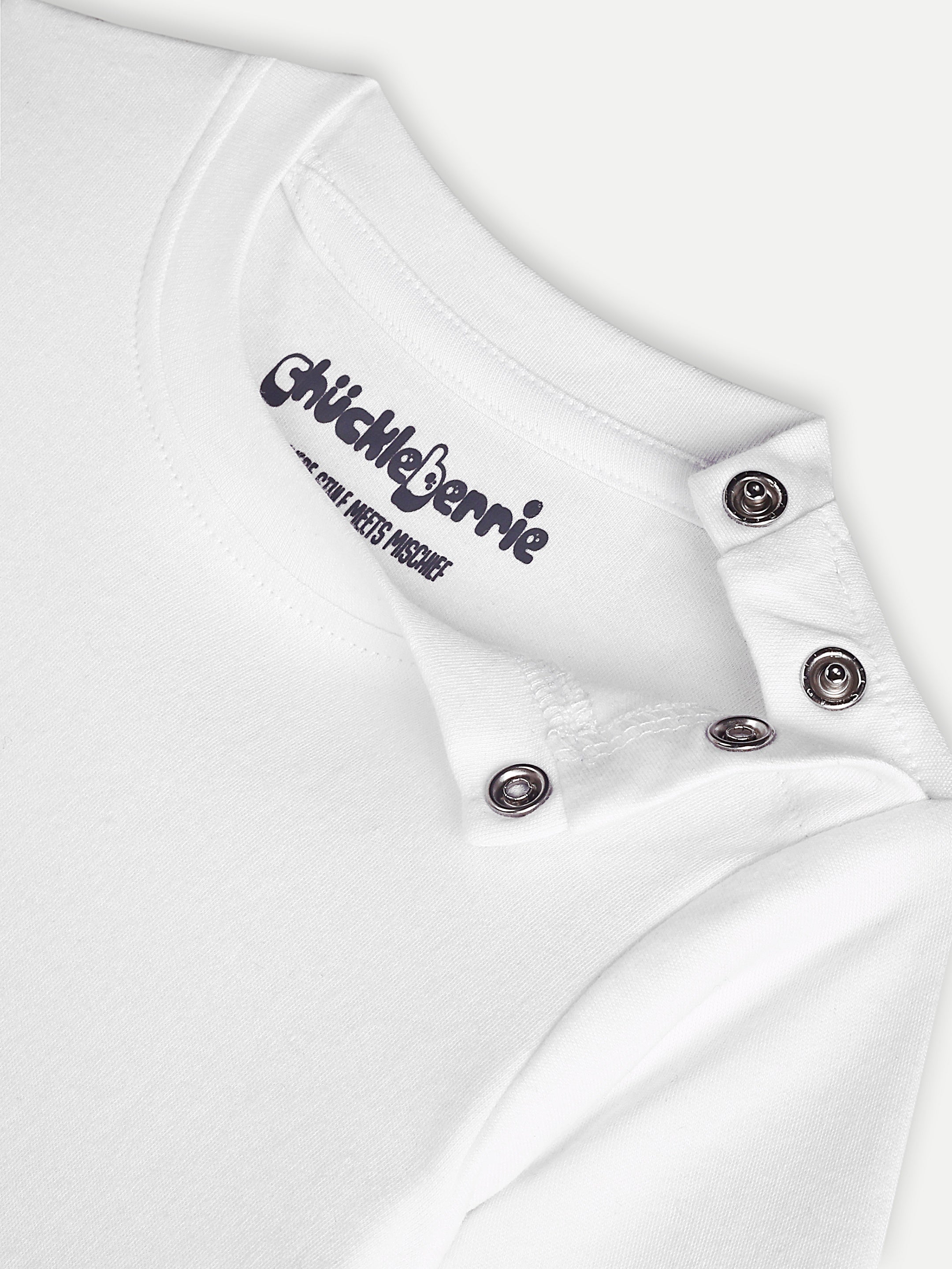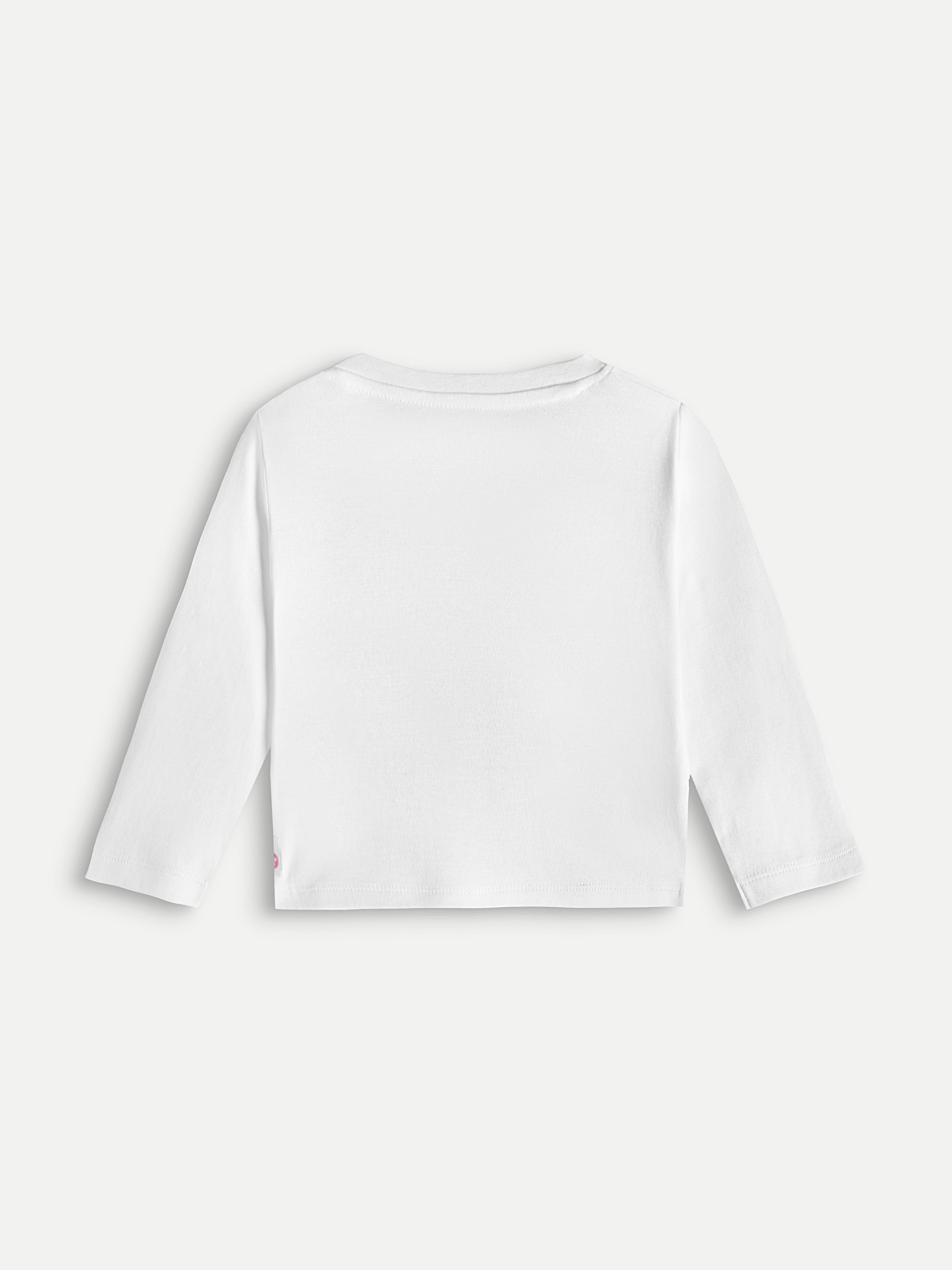 Printed t-shirt with full sleeves, round neck with snap buttons on shoulder and made from cotton interlock.