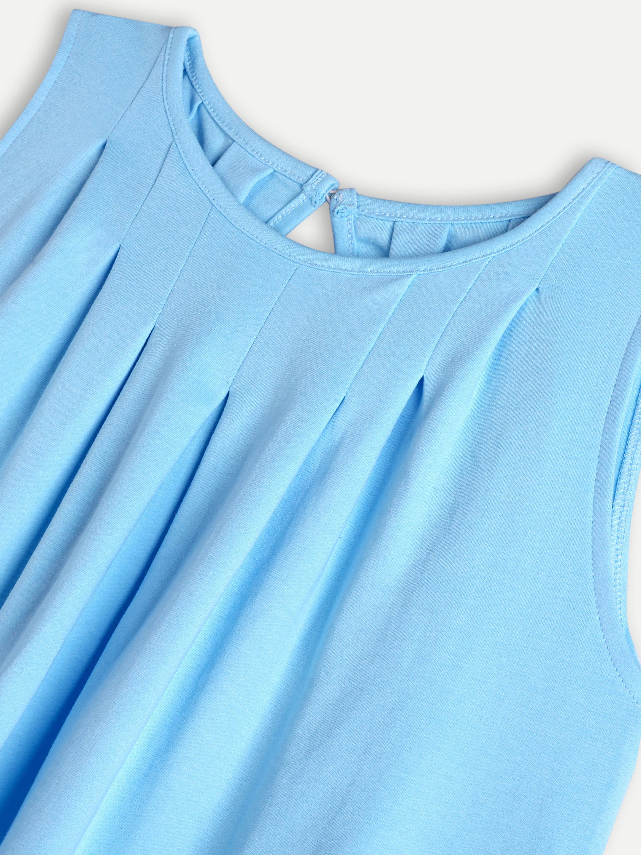 Sleeveless, bouncy Interlock A-line dress, features a round neck, front and back pleats, and a back loop closure.