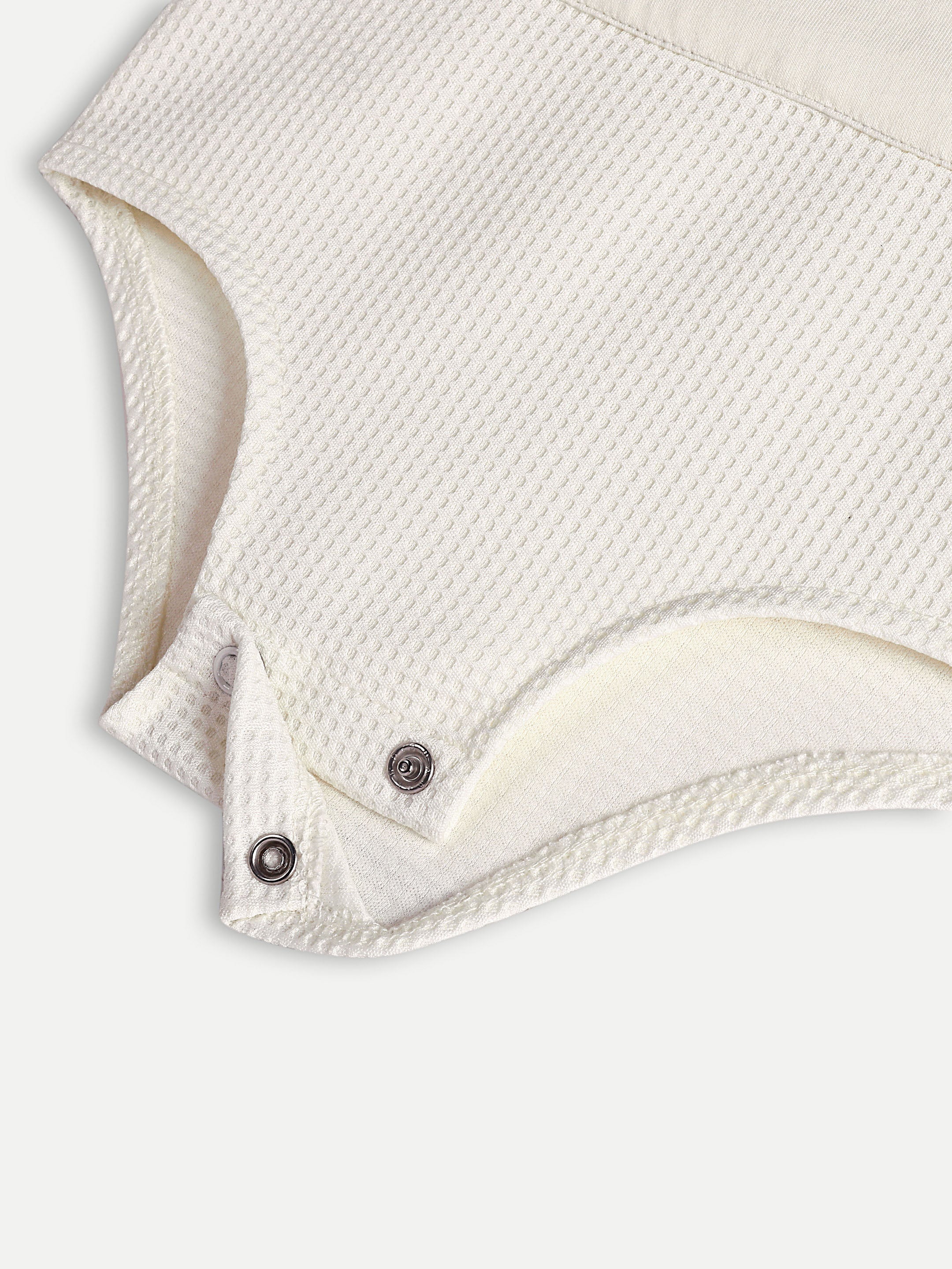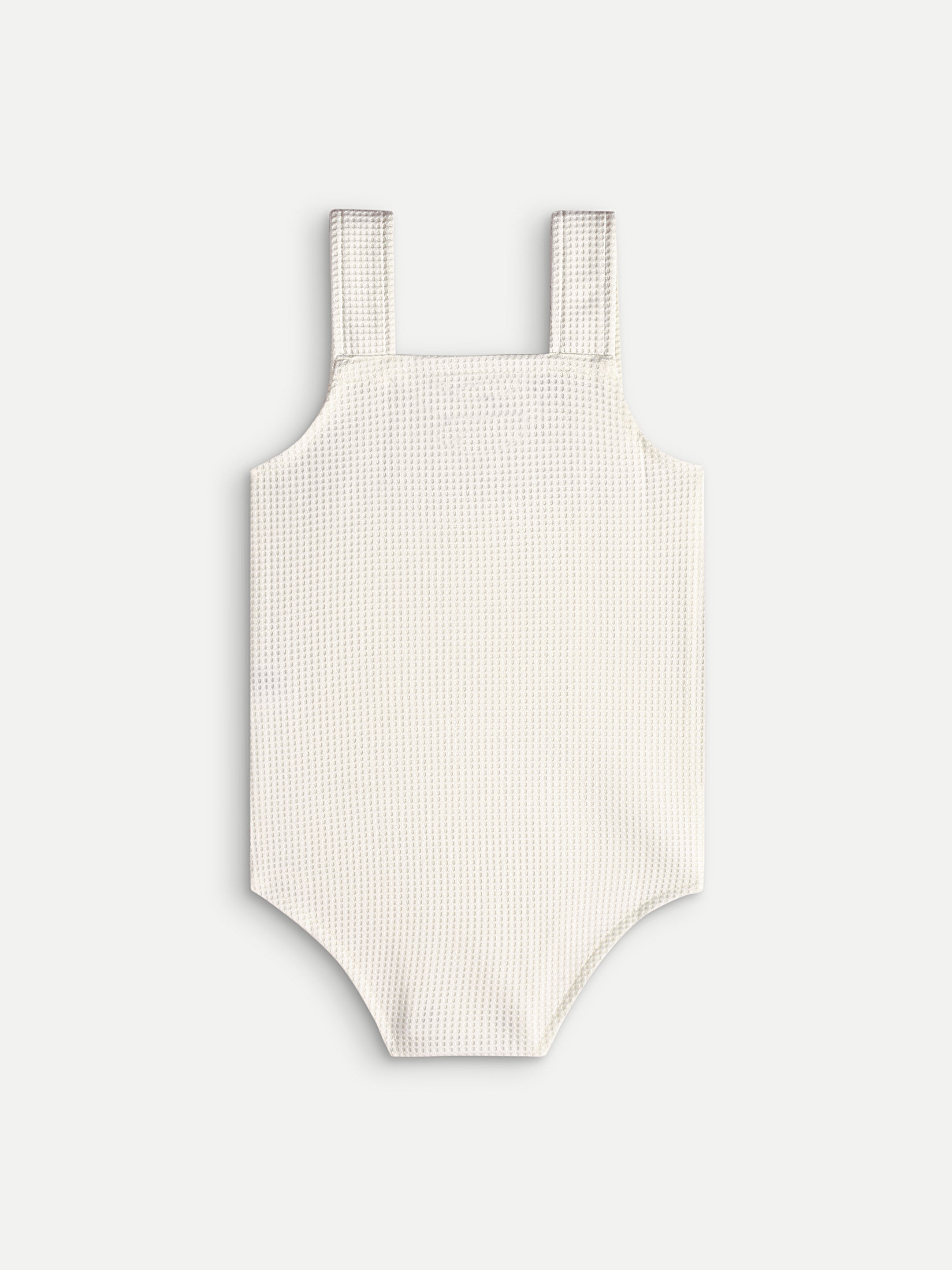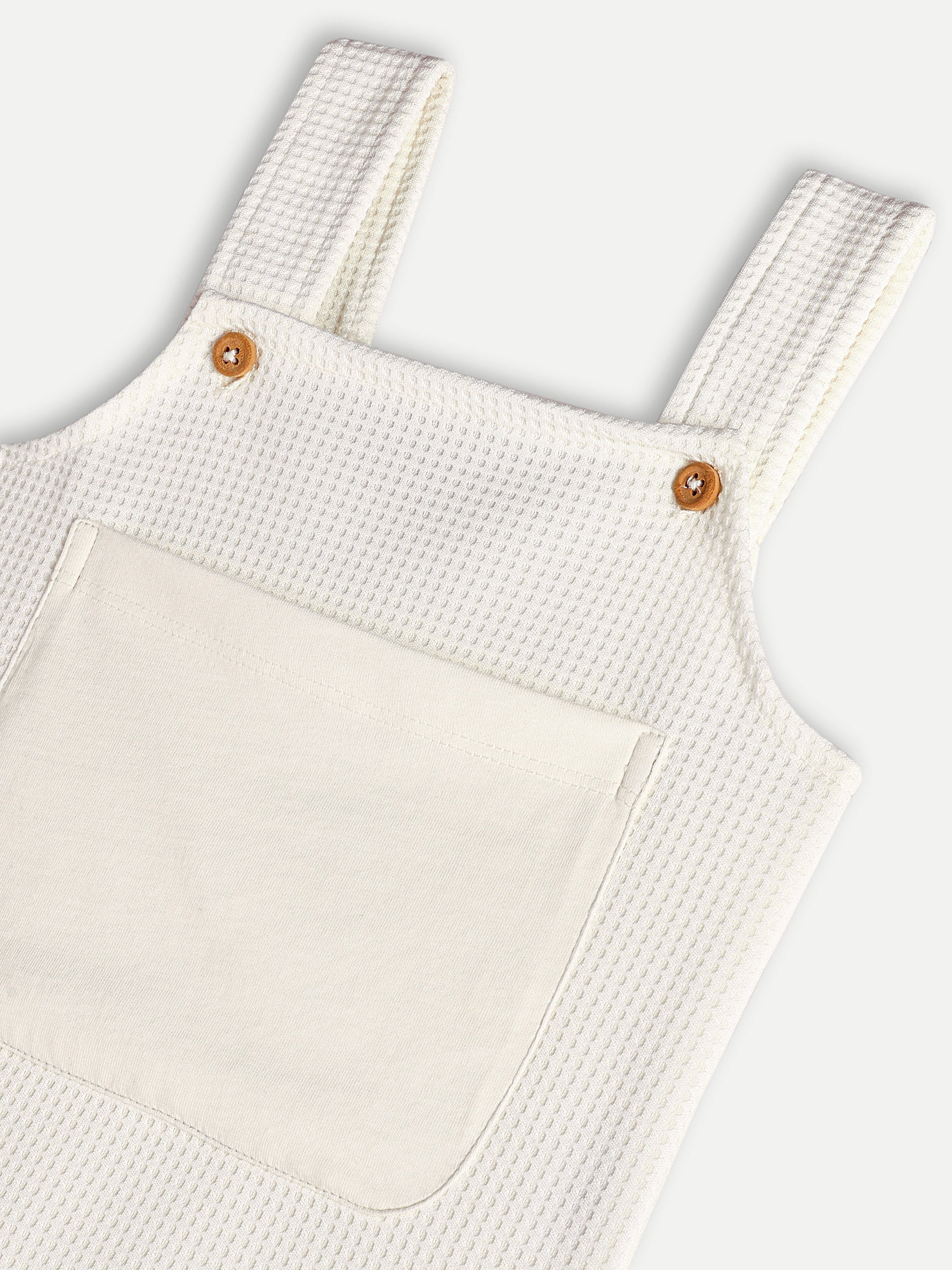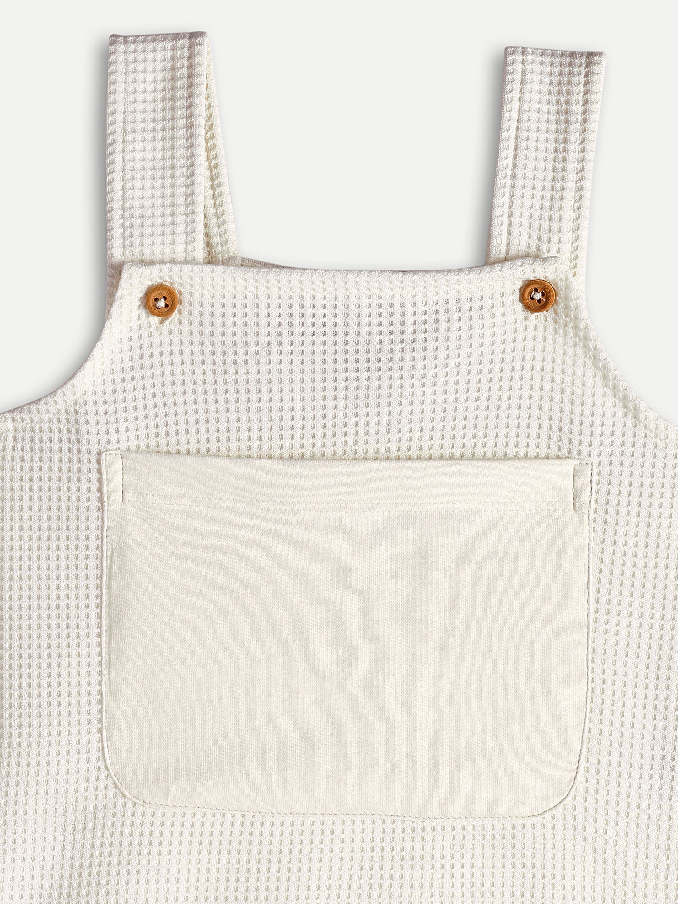 Cotton waffle onesies features soft shoulder straps with square buttons, a tiny front pocket and snap buttons at the bottom.
