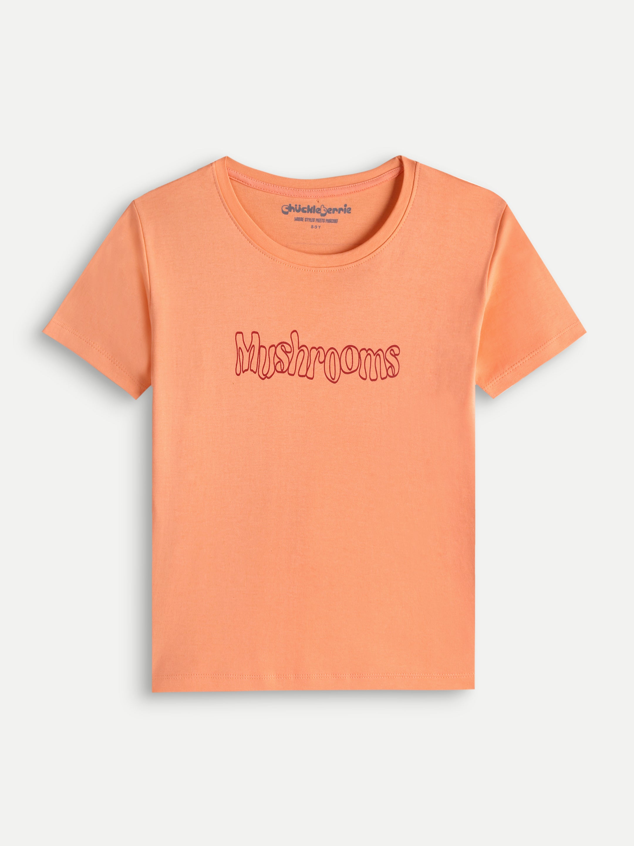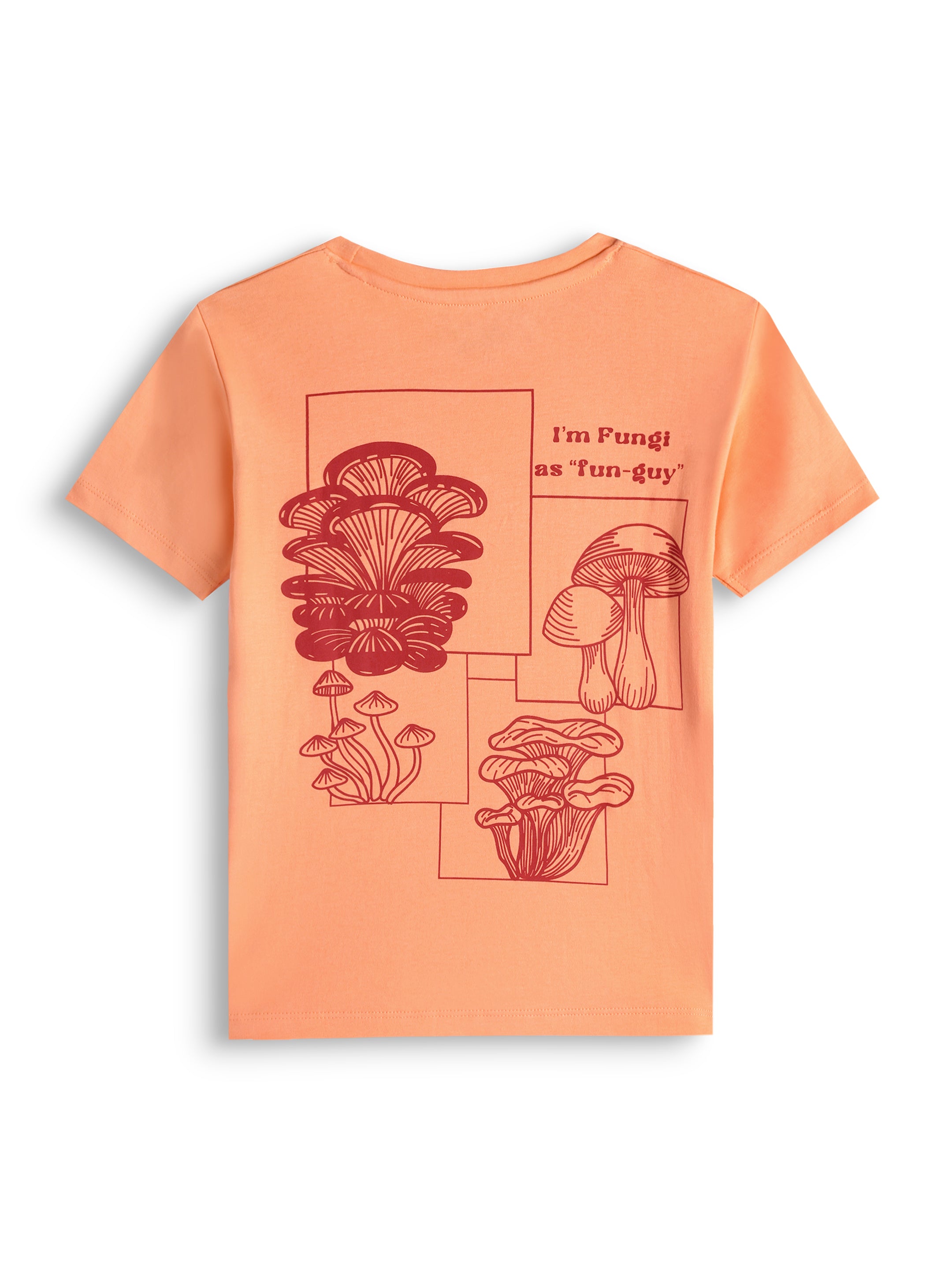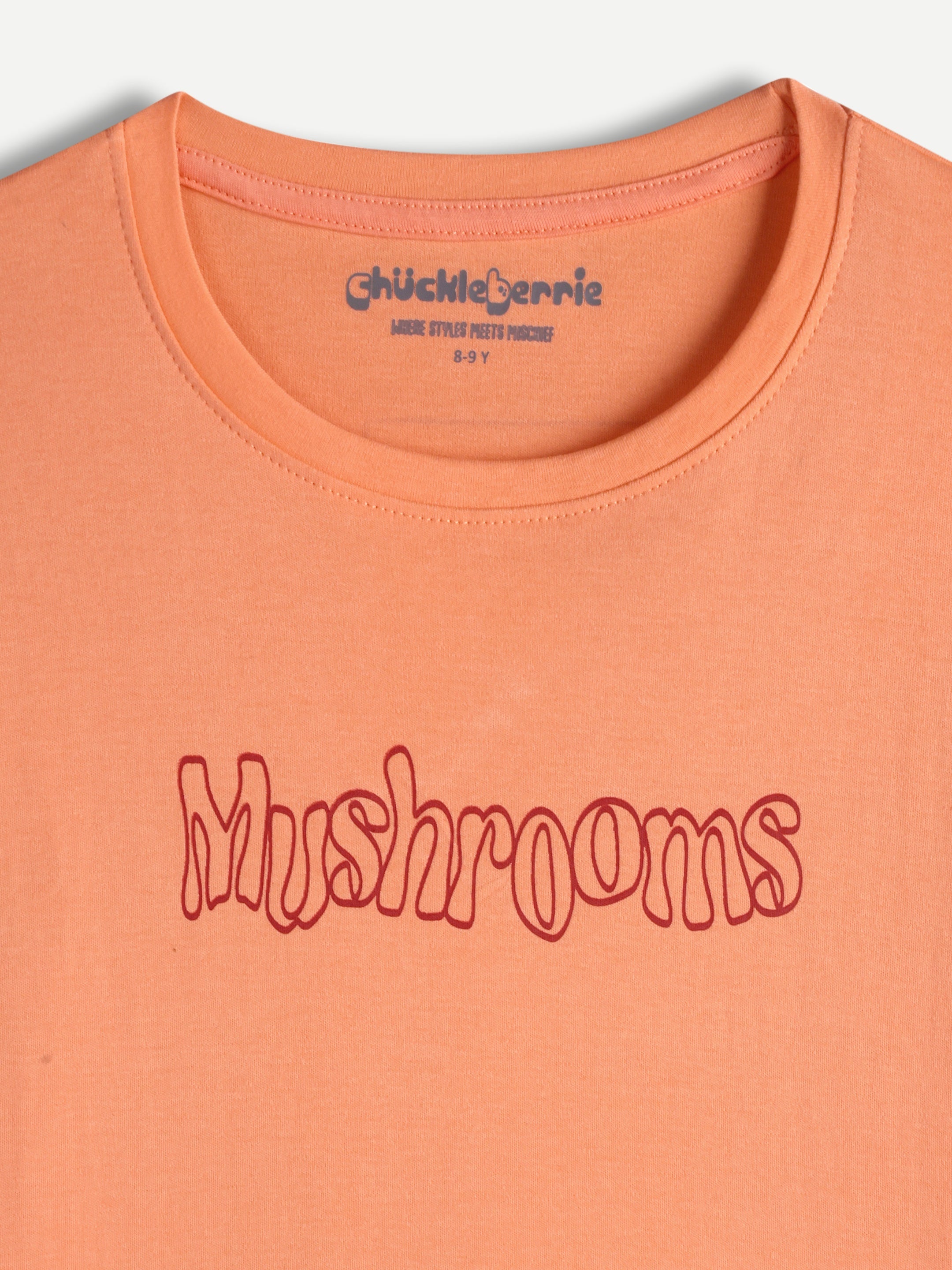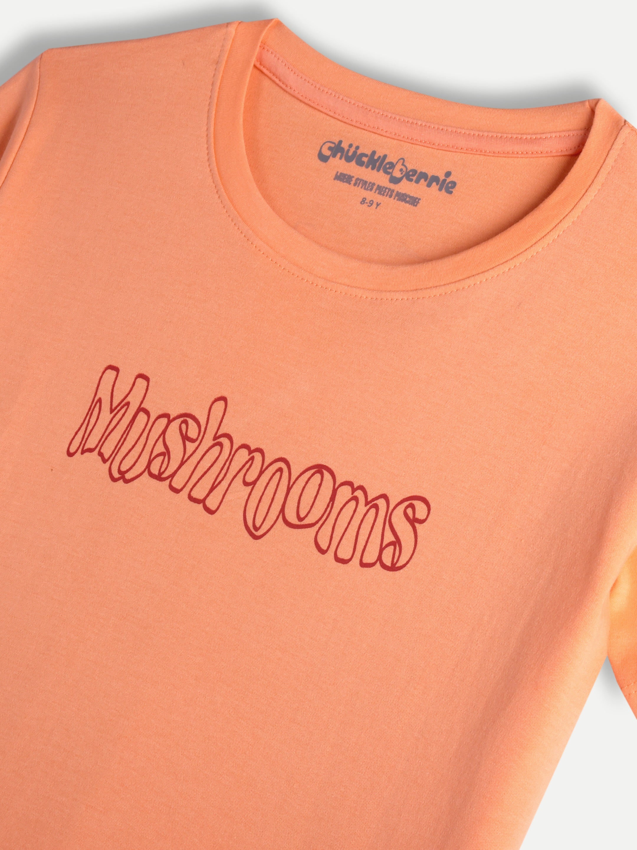 Soft pink oversize, interlock knit tee featuring a crew neck and short sleeves. The front has a whimsical “Mushrooms” text design, while the back showcases artistic red mushroom illustrations with the playful caption.