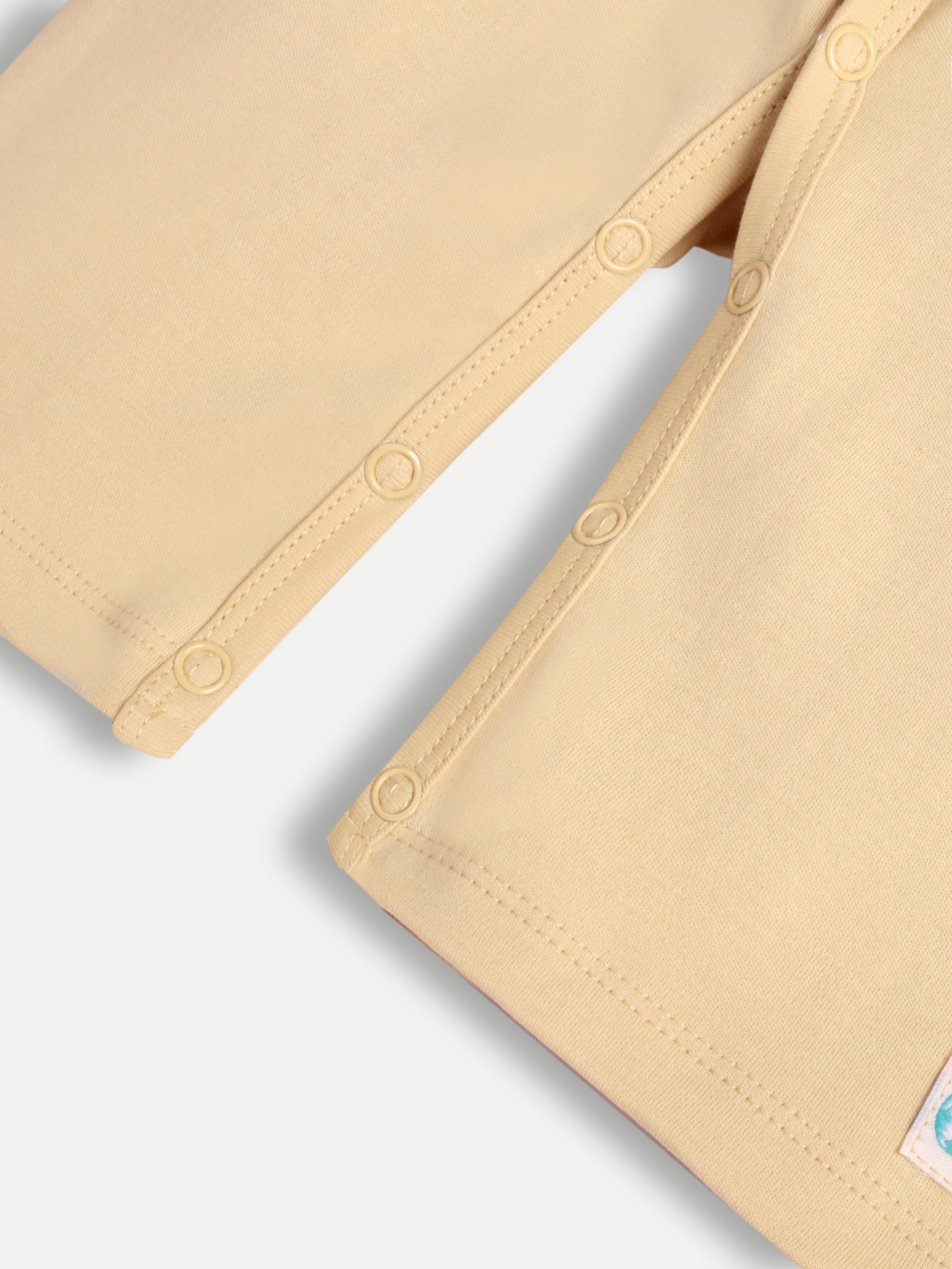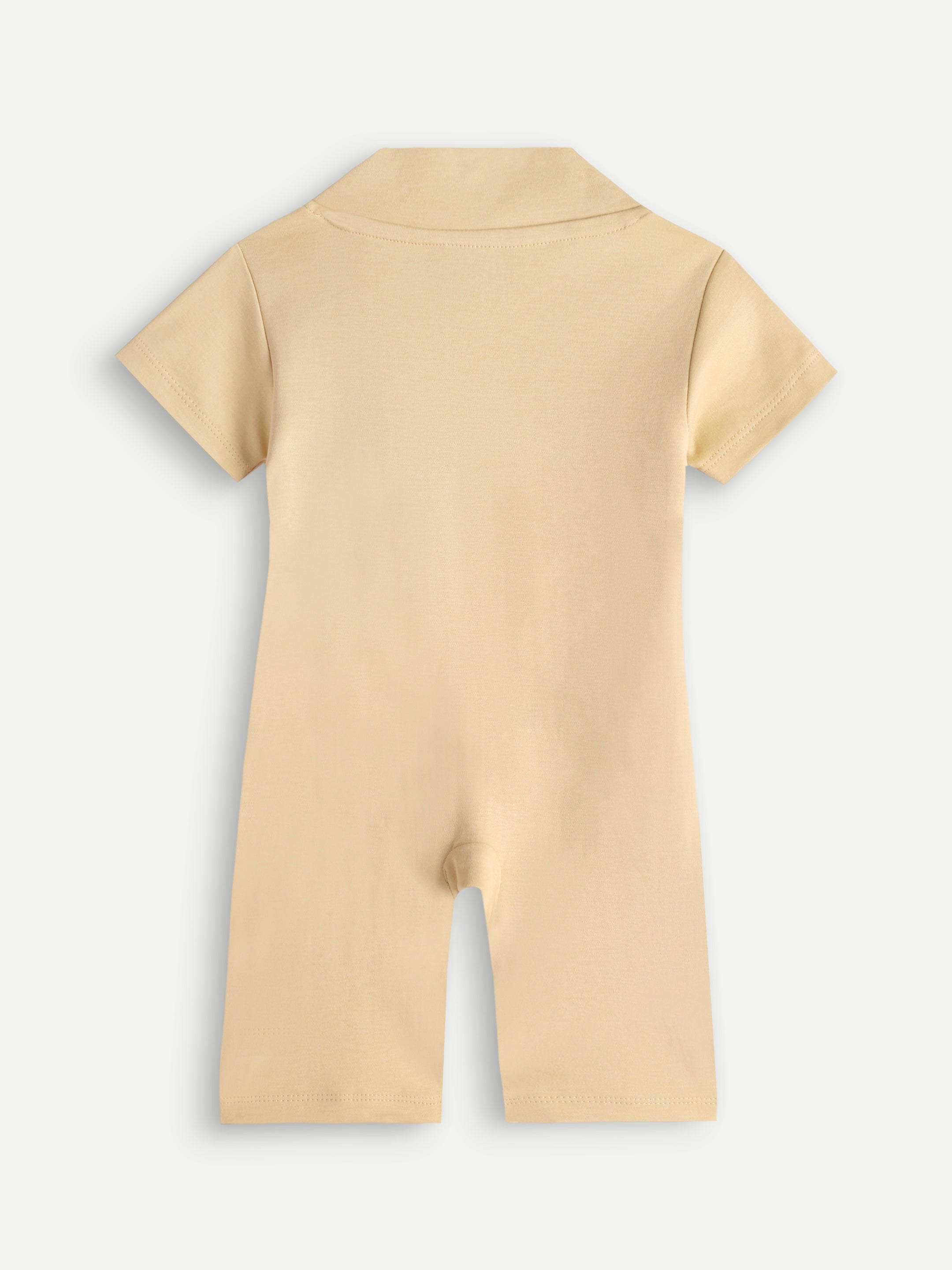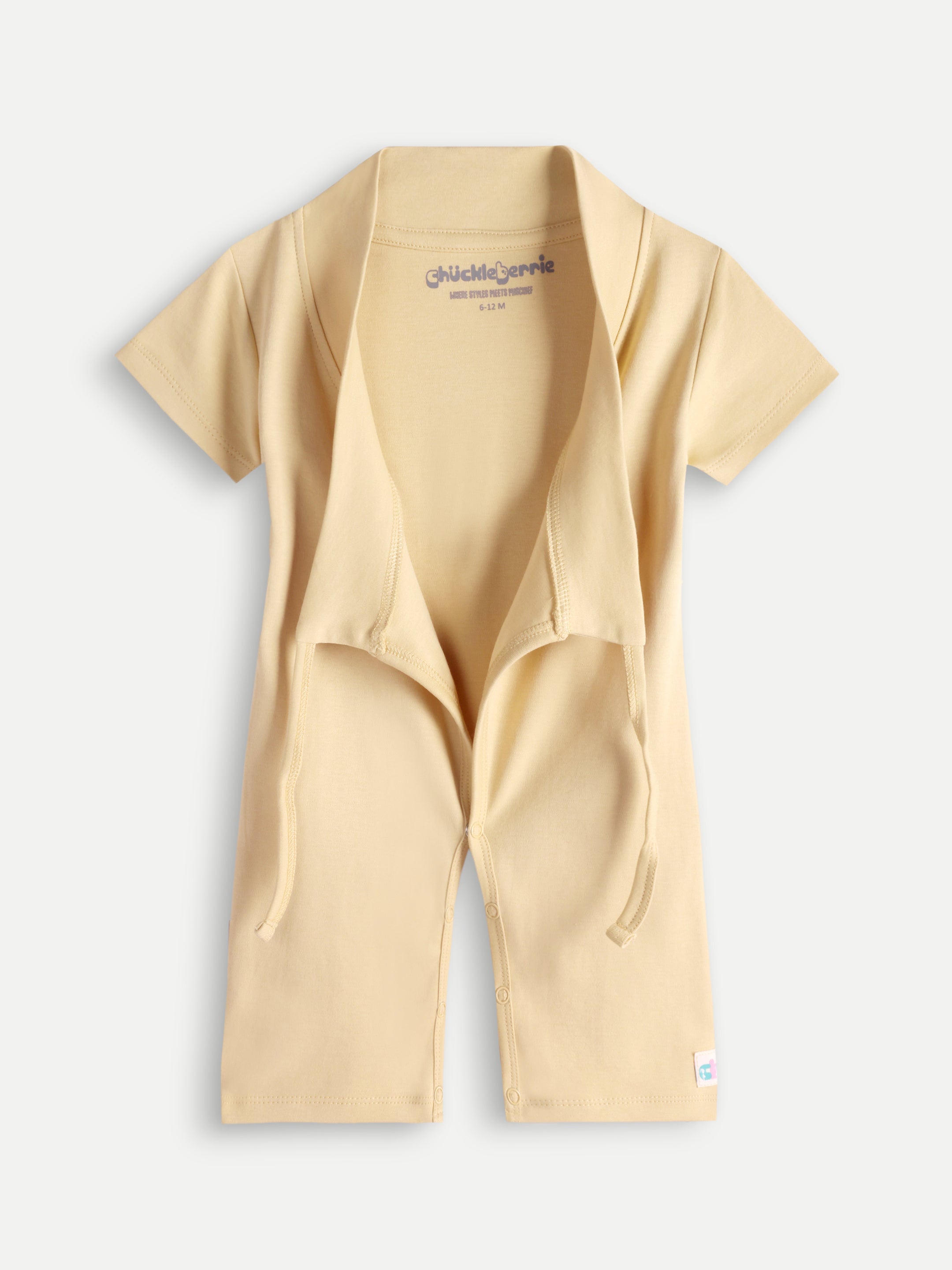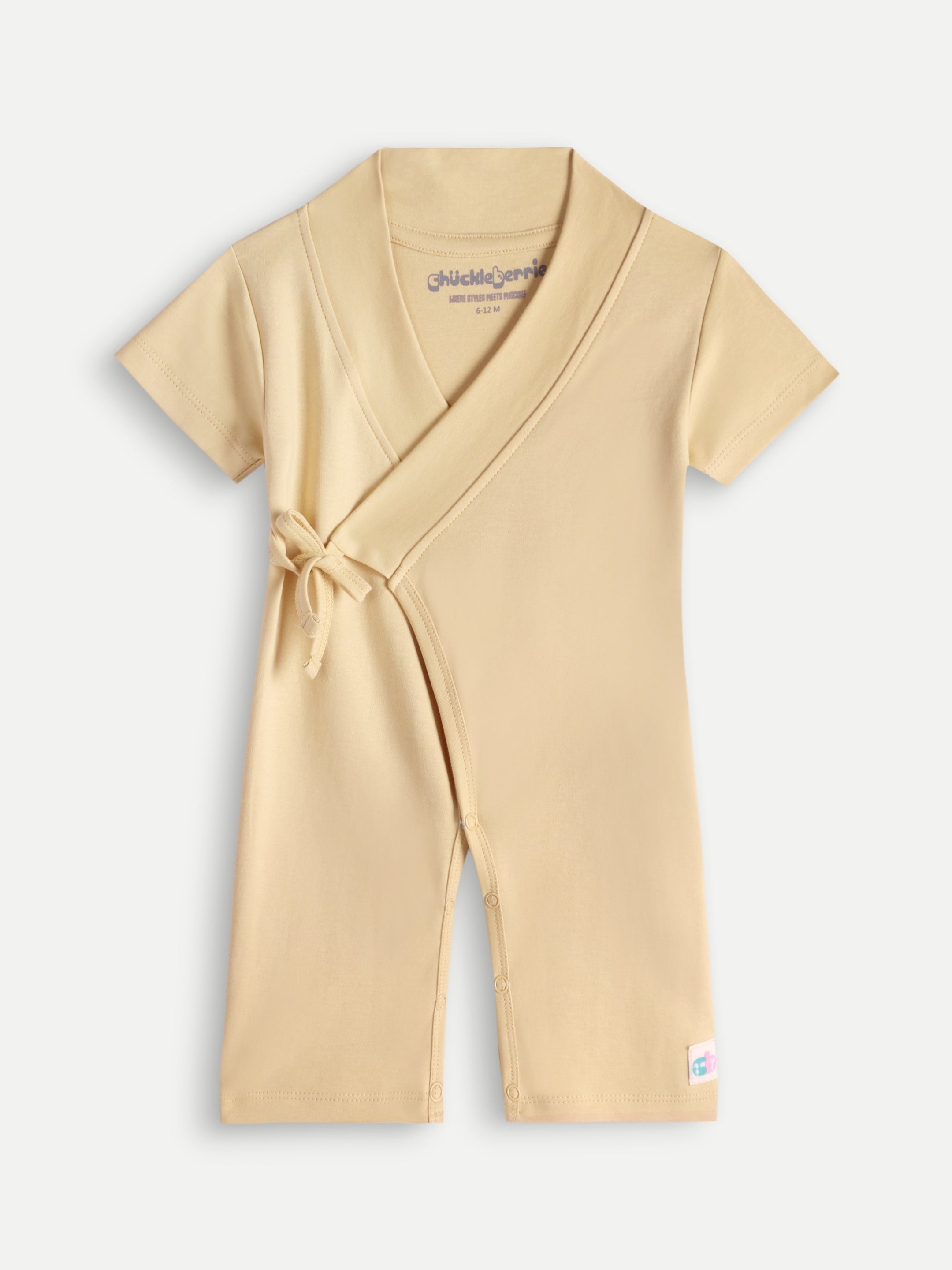 Short-sleeve Cotton muslin romper with a kimono-style wrap front, secured by side ties and snap buttons at the crotch for easy dressing. Designed for comfort with a clean, seamless back and soft fabric construction.