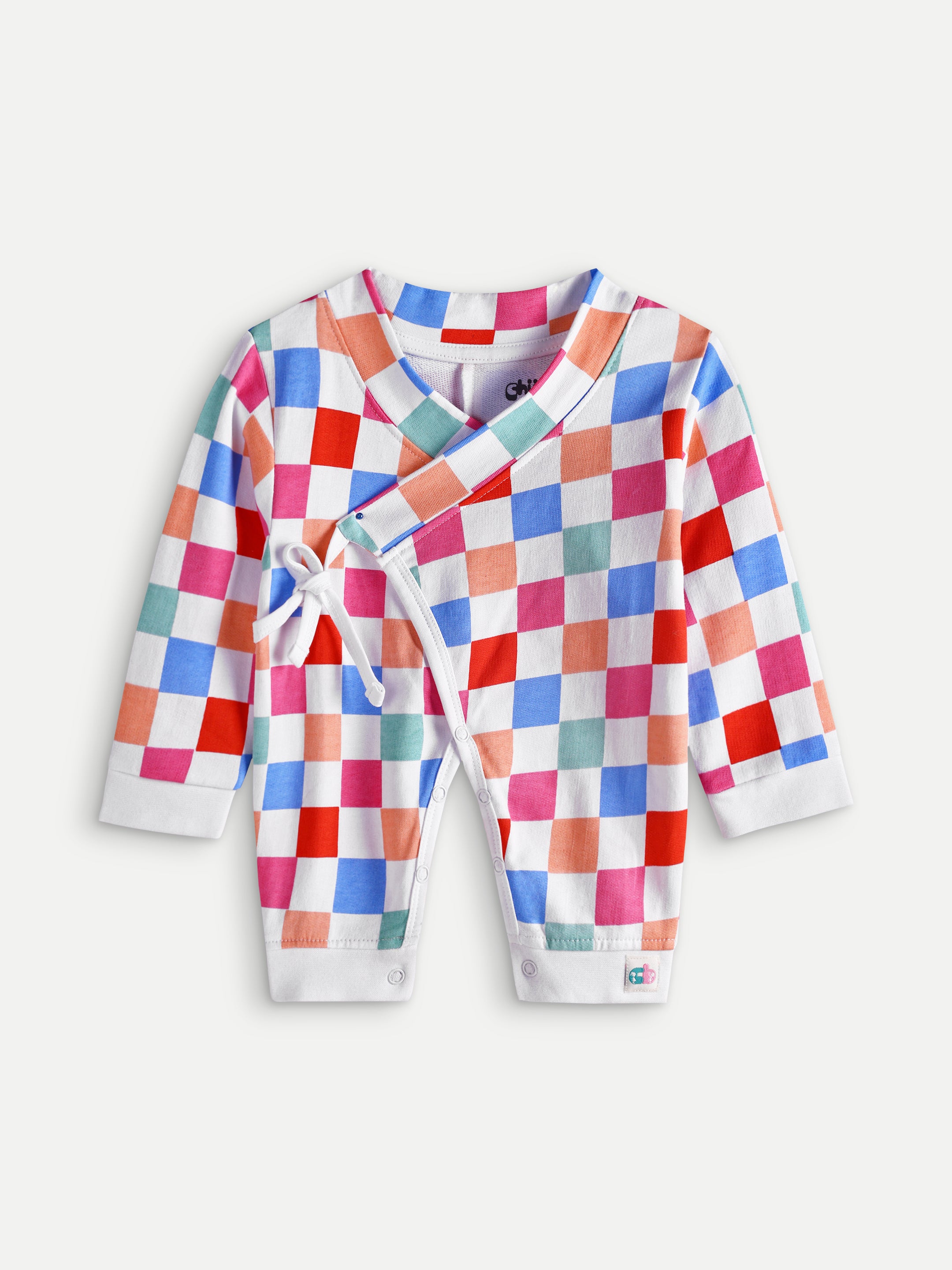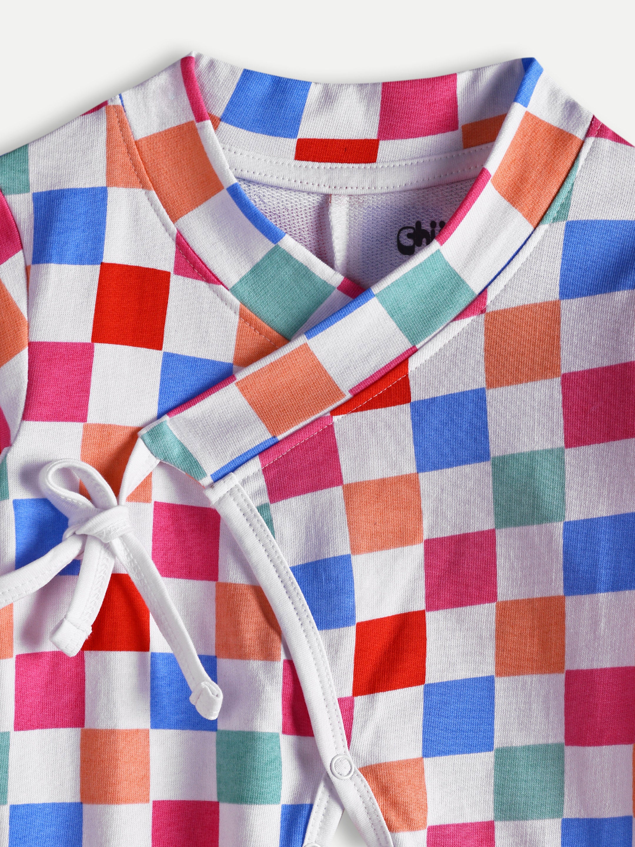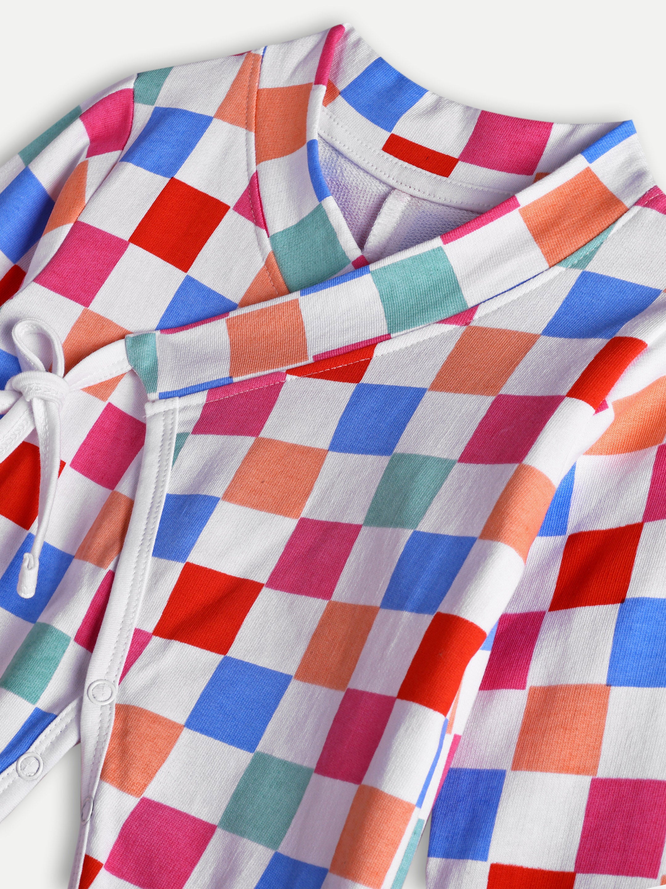 Cozy French terry baby romper with colorful checks, wrap-up tie design, and bottom snaps. Soft, durable, and designed for everyday comfort.