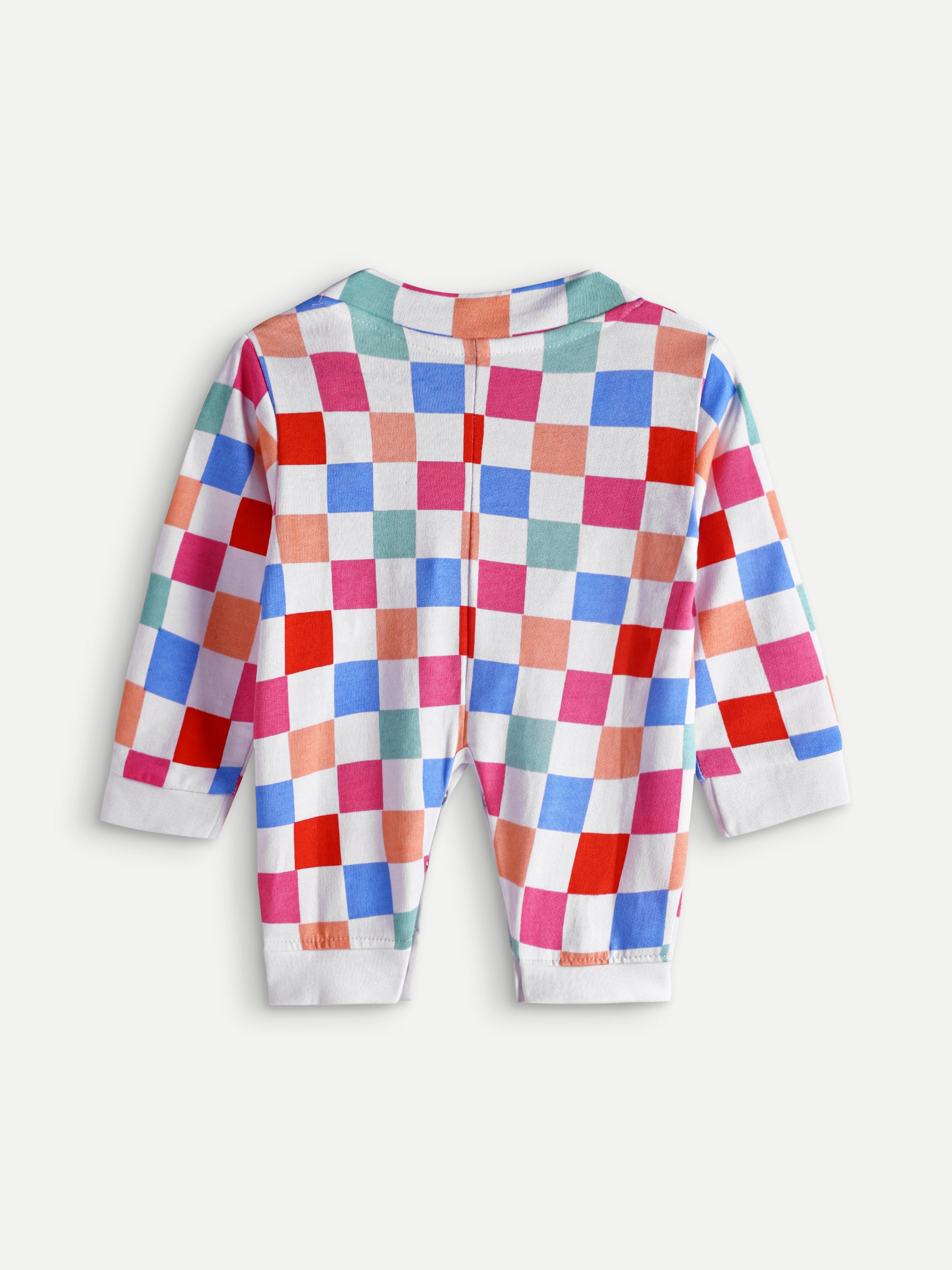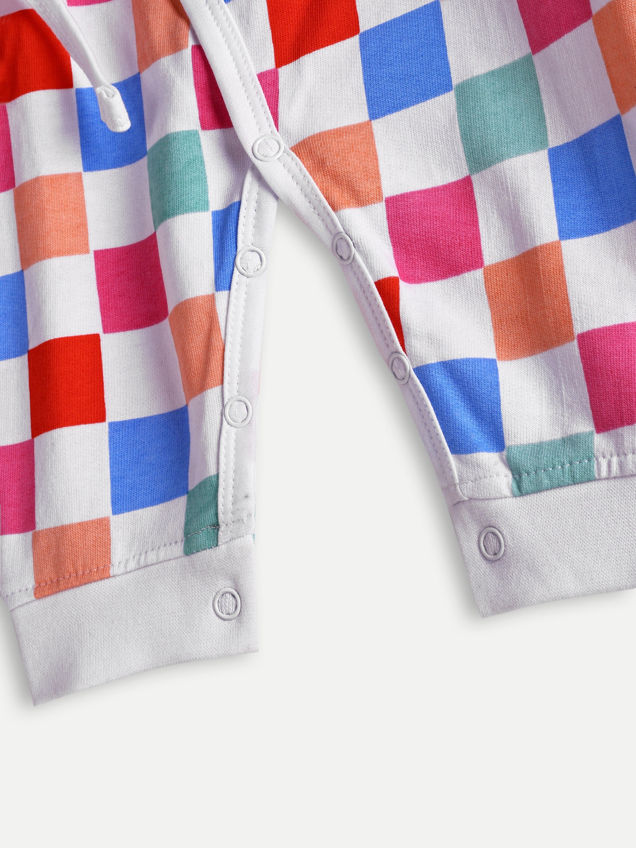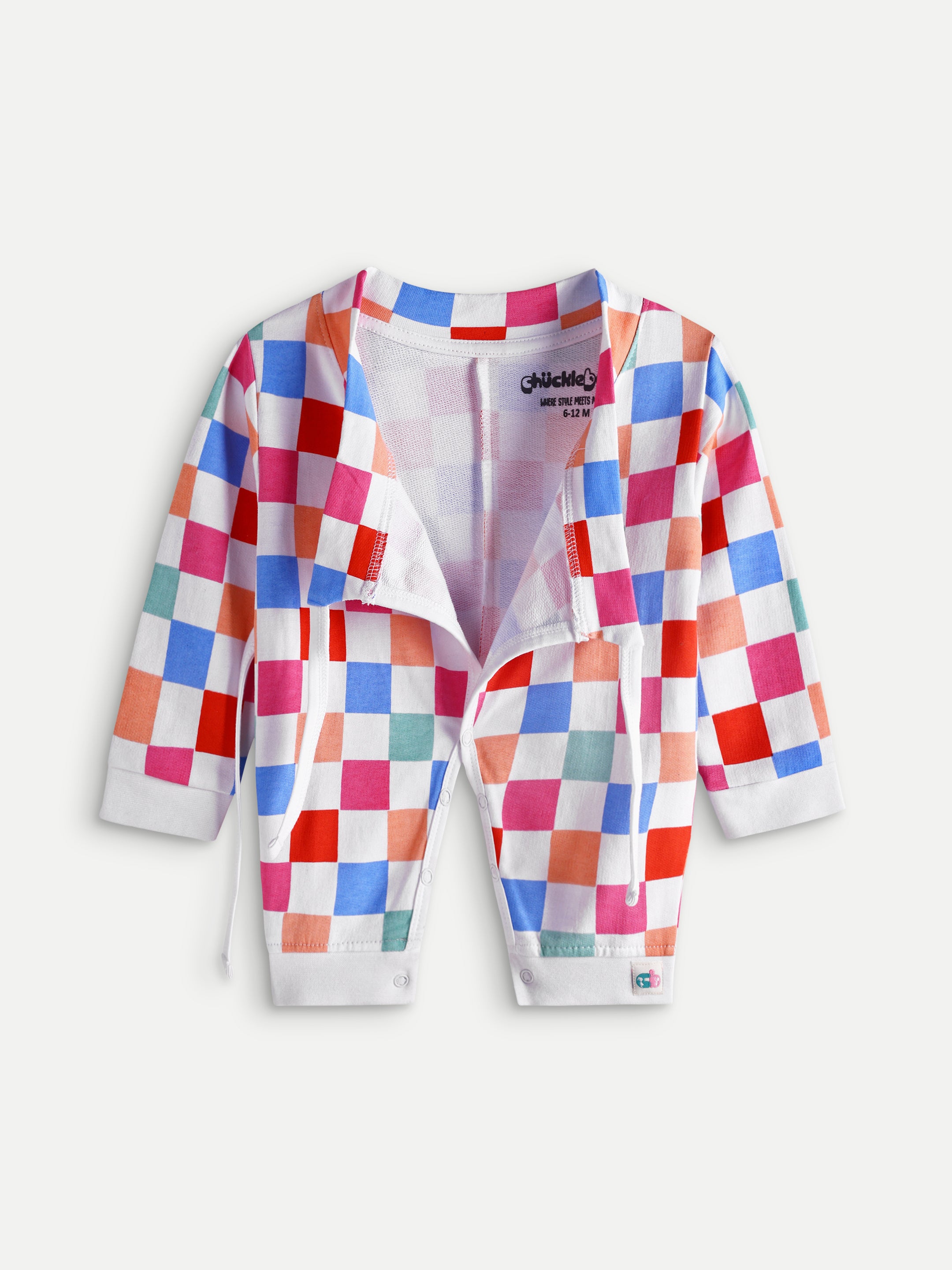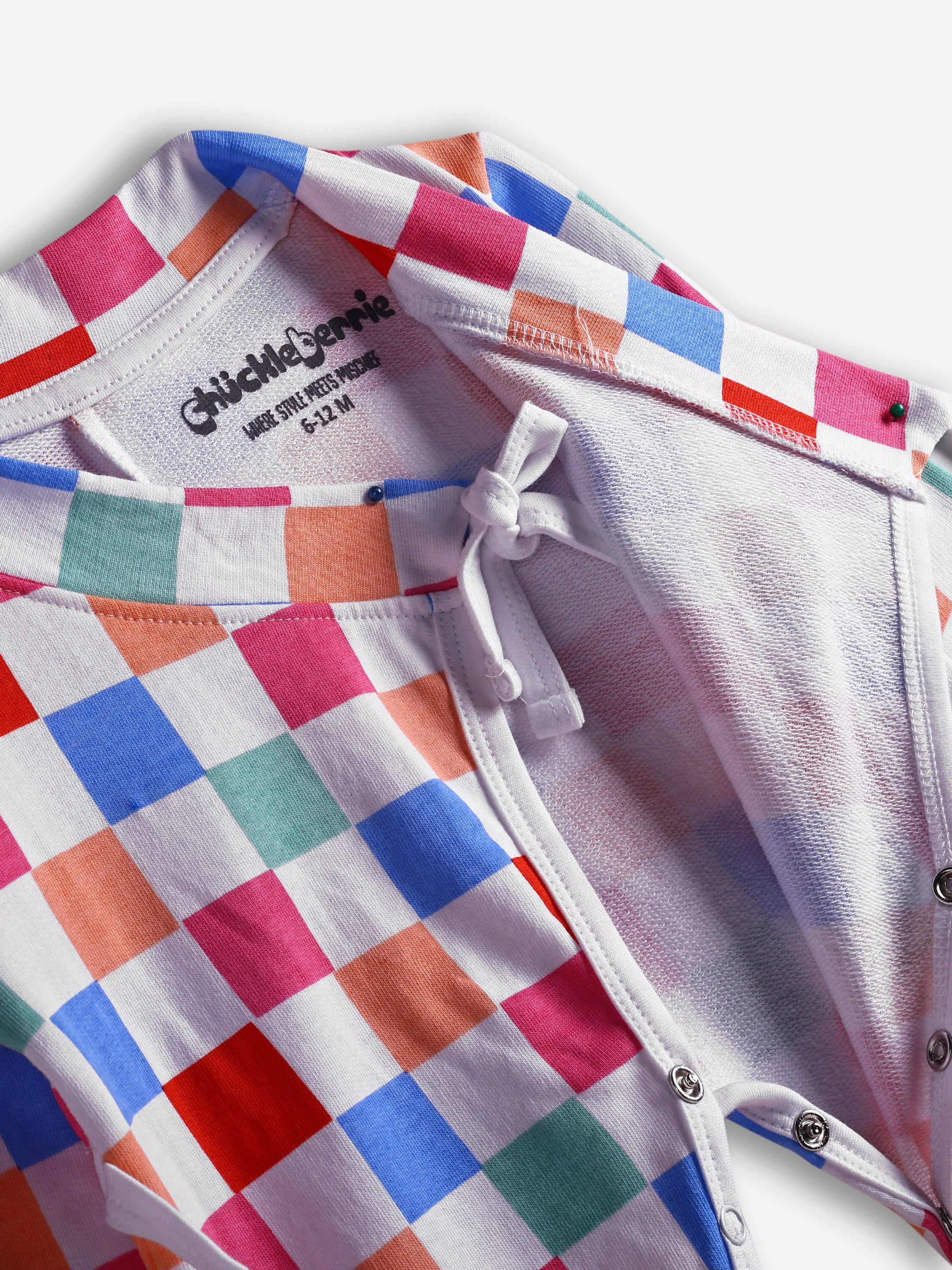 Cozy French terry baby romper with colorful checks, wrap-up tie design, and bottom snaps. Soft, durable, and designed for everyday comfort.