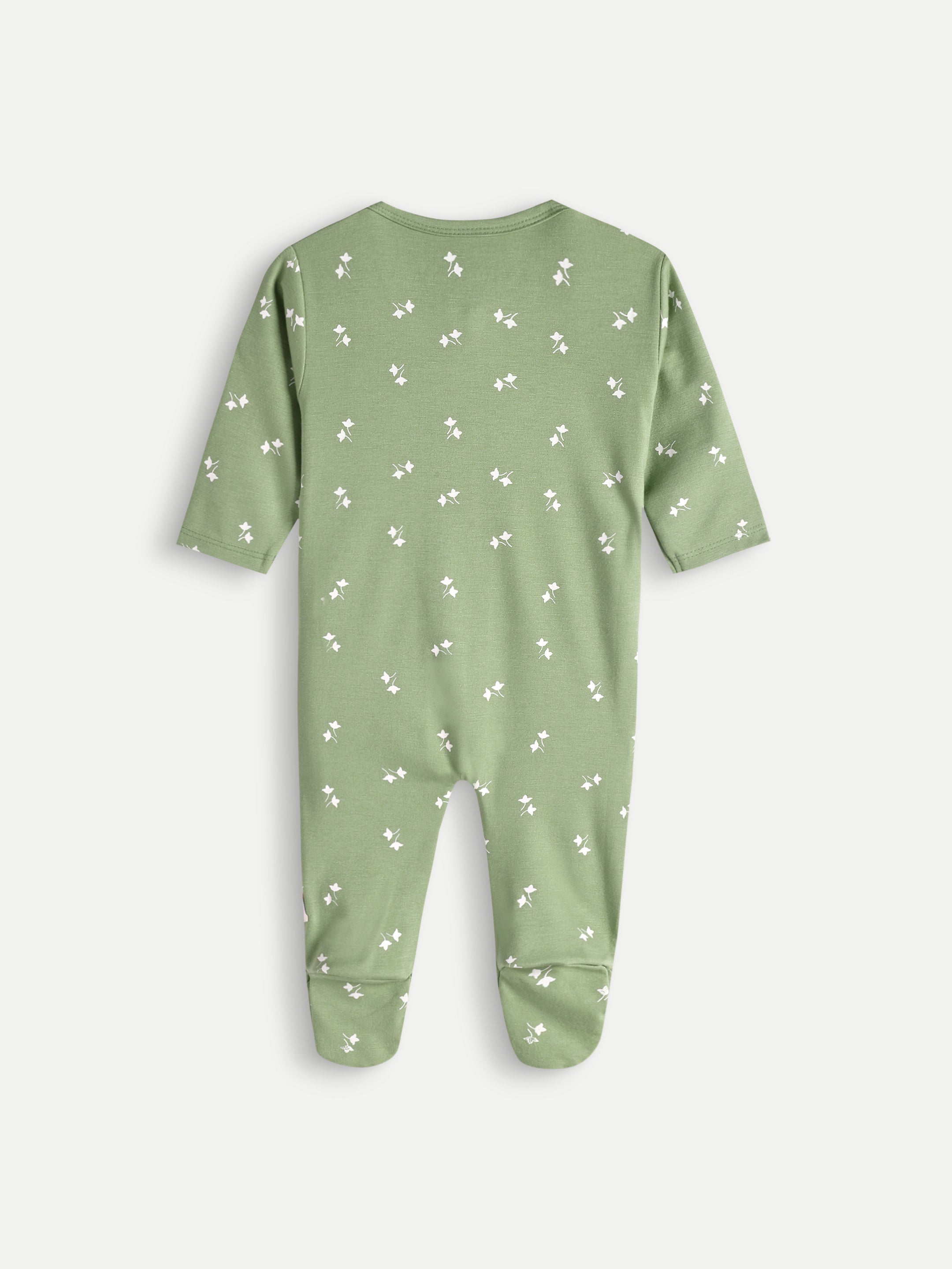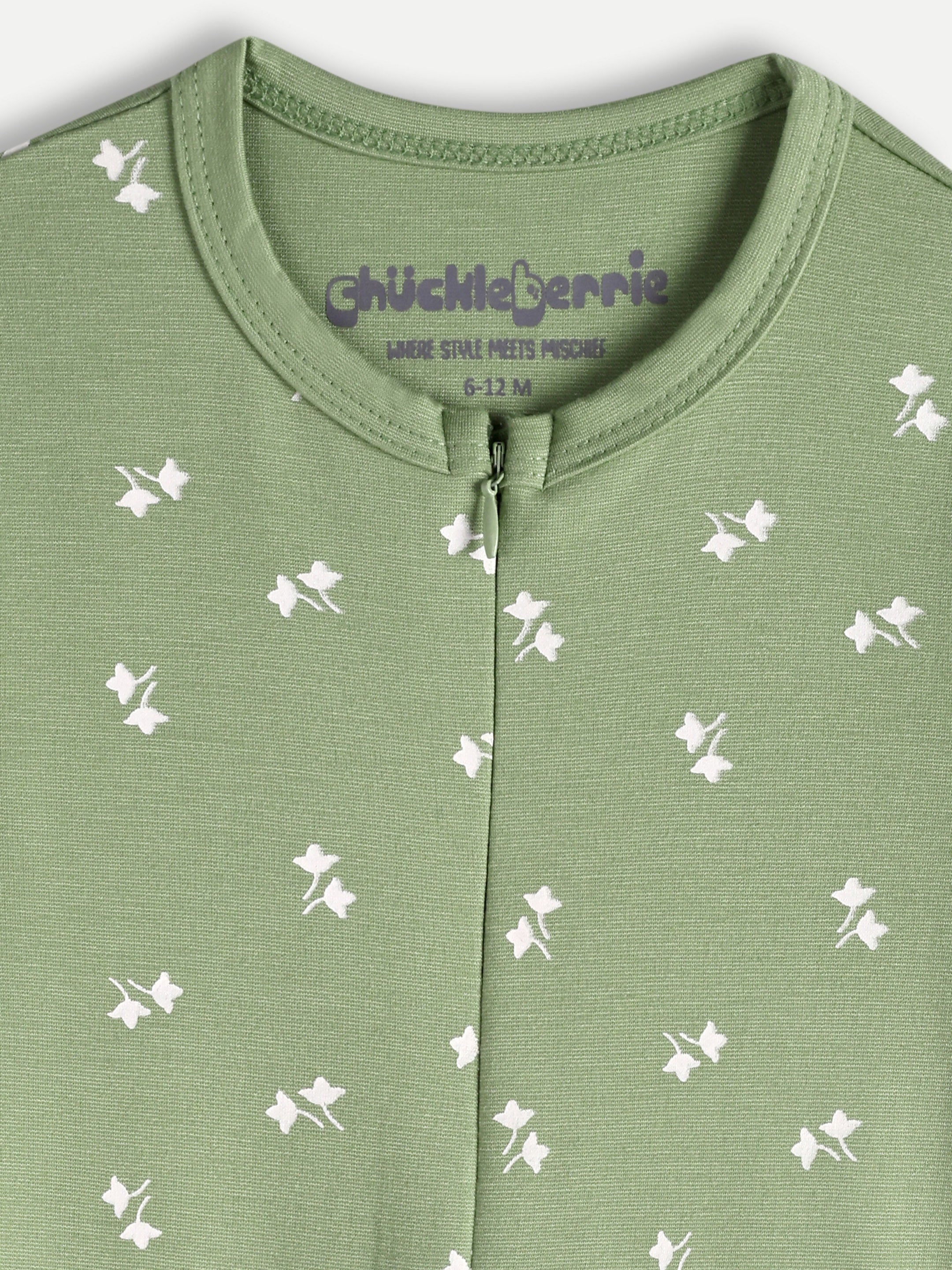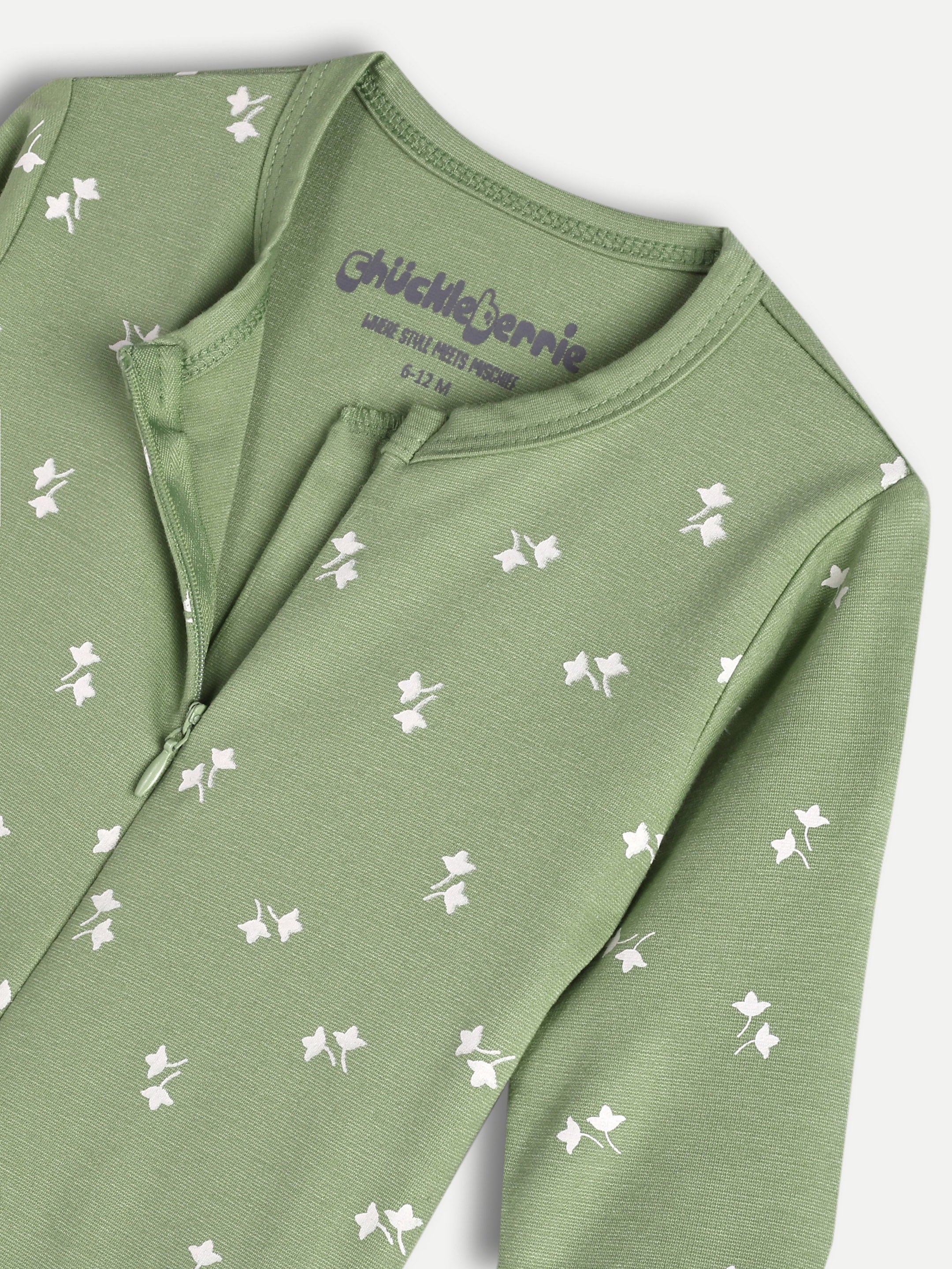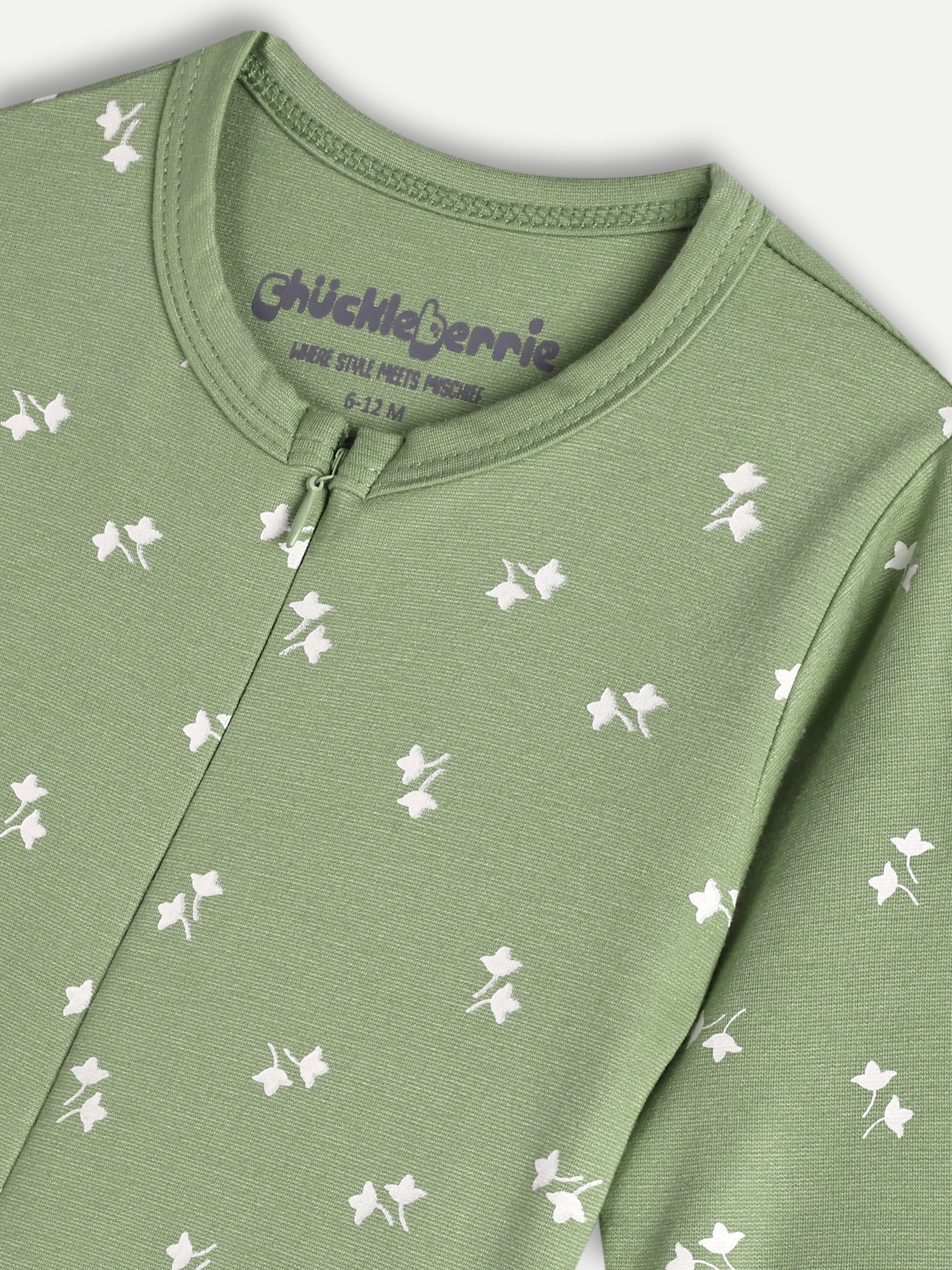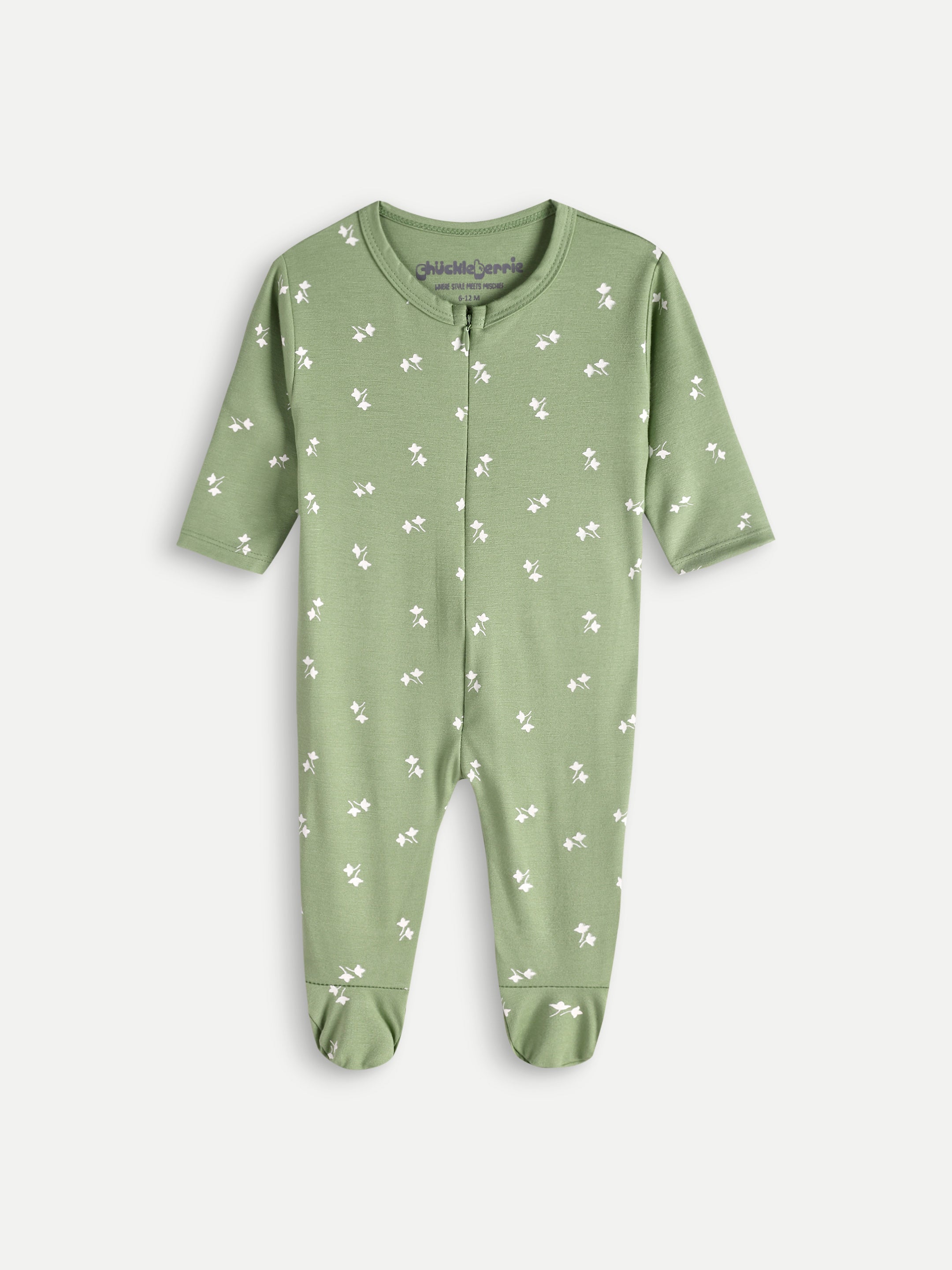 Printed full sleeves soft high quality tensil footed romper with front open zip and crew neck.